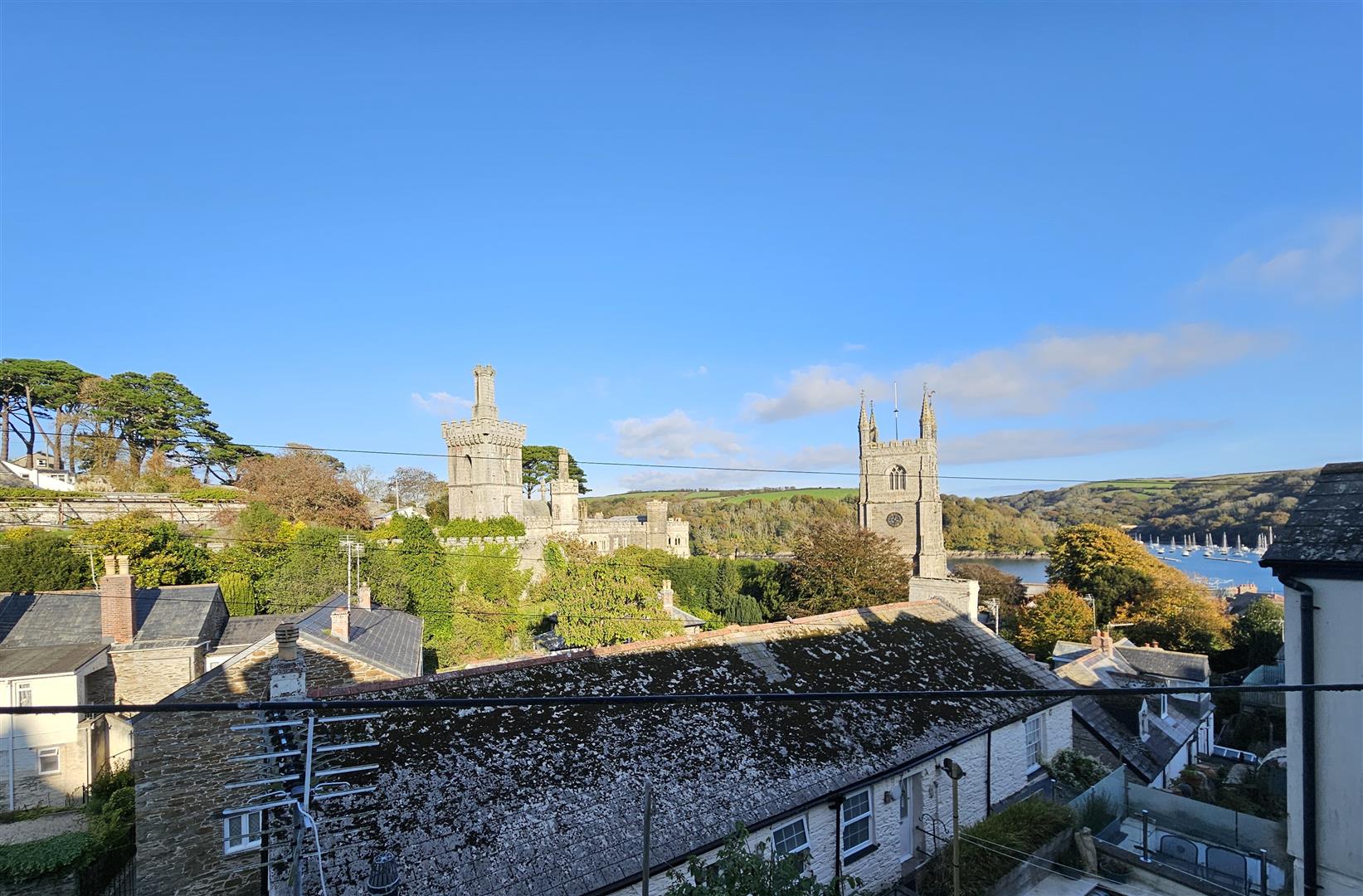 The second double bedroom has lovely views over the roof tops to the iconic Place, St Fimbarrus Church, Fowey estuary and countryside beyond.