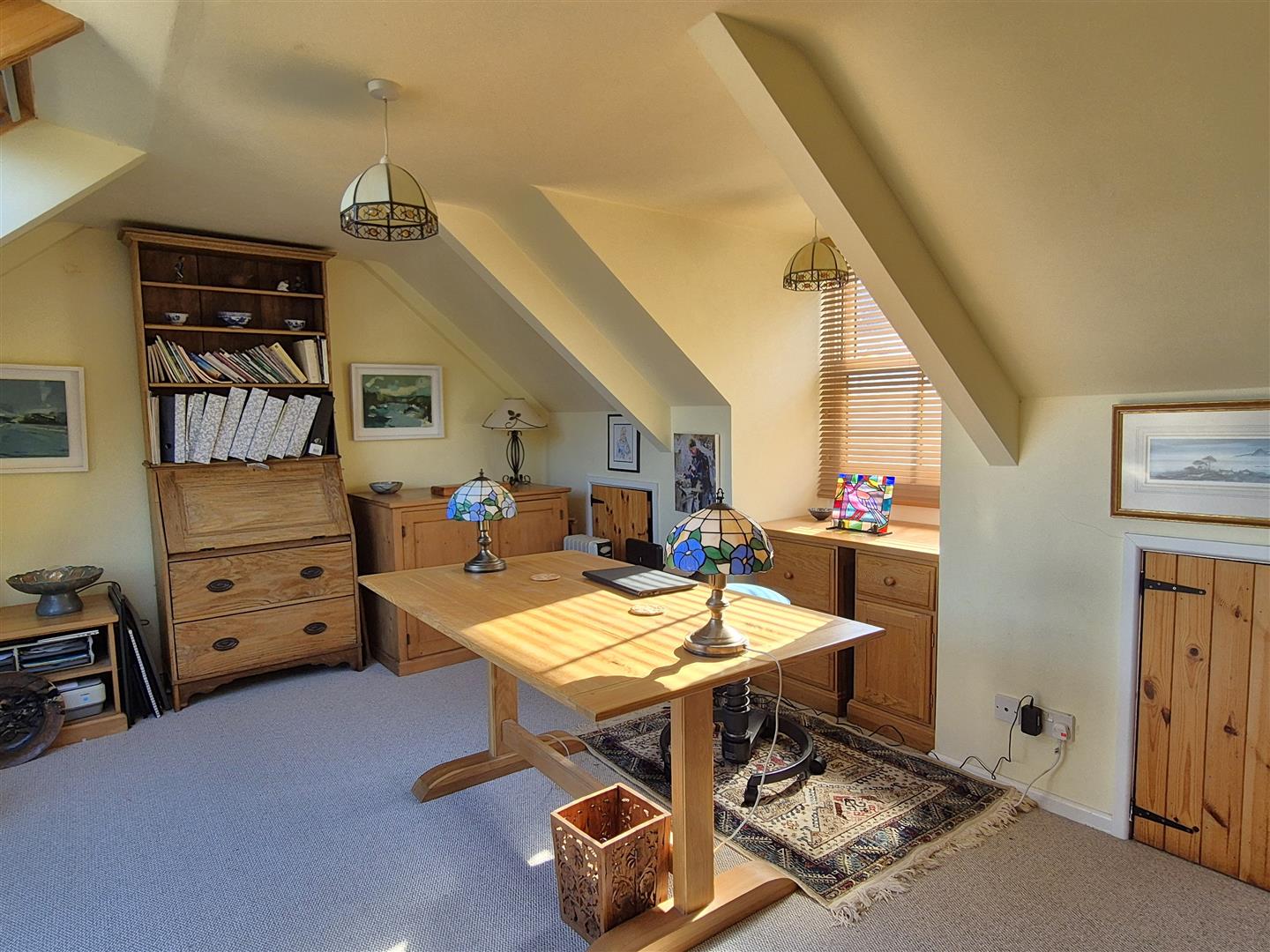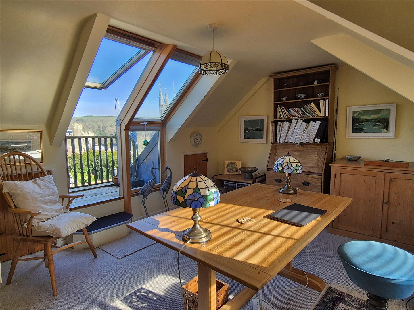 The second floor has a lovely light and airy attic room, currently used as a study but would double up as an occasional third bedroom, with Velux roof terrace windows which open to a decked balcony area, again providing fabulous harbour views and views across to the countryside on the east bank.