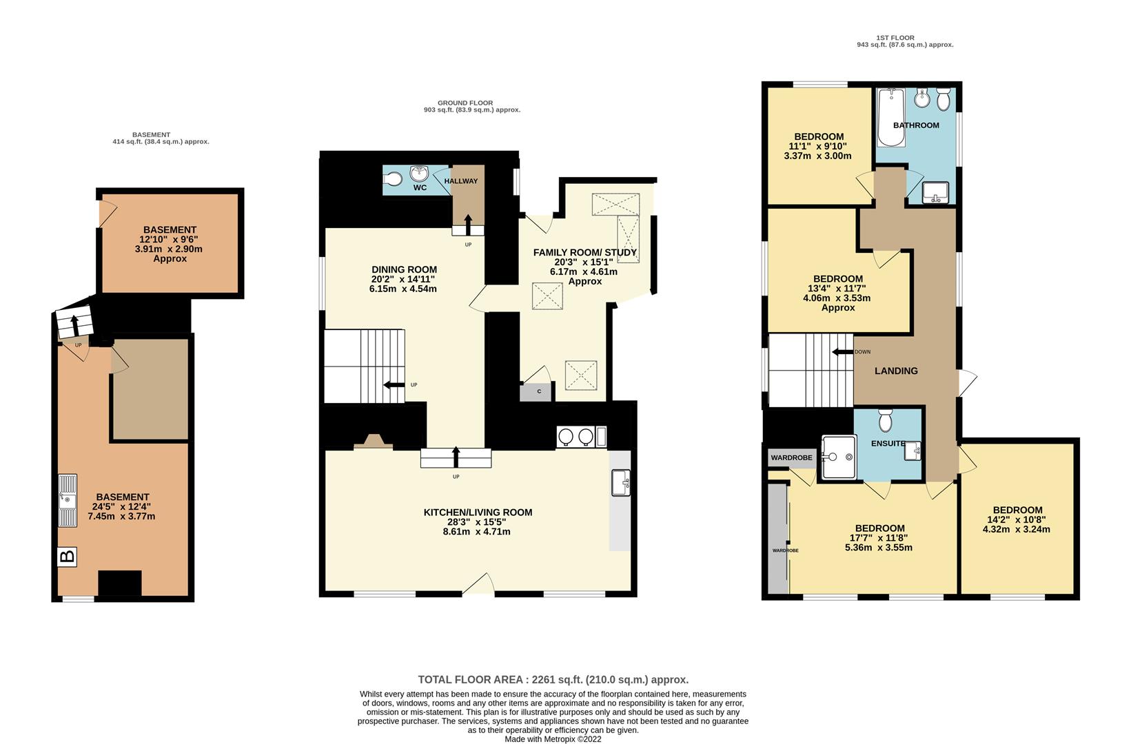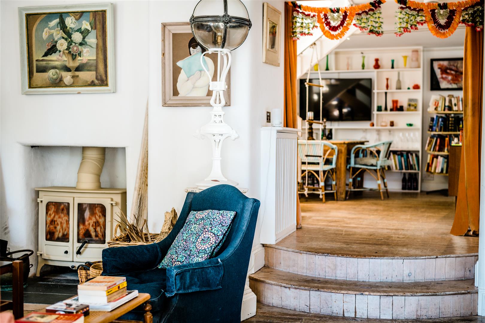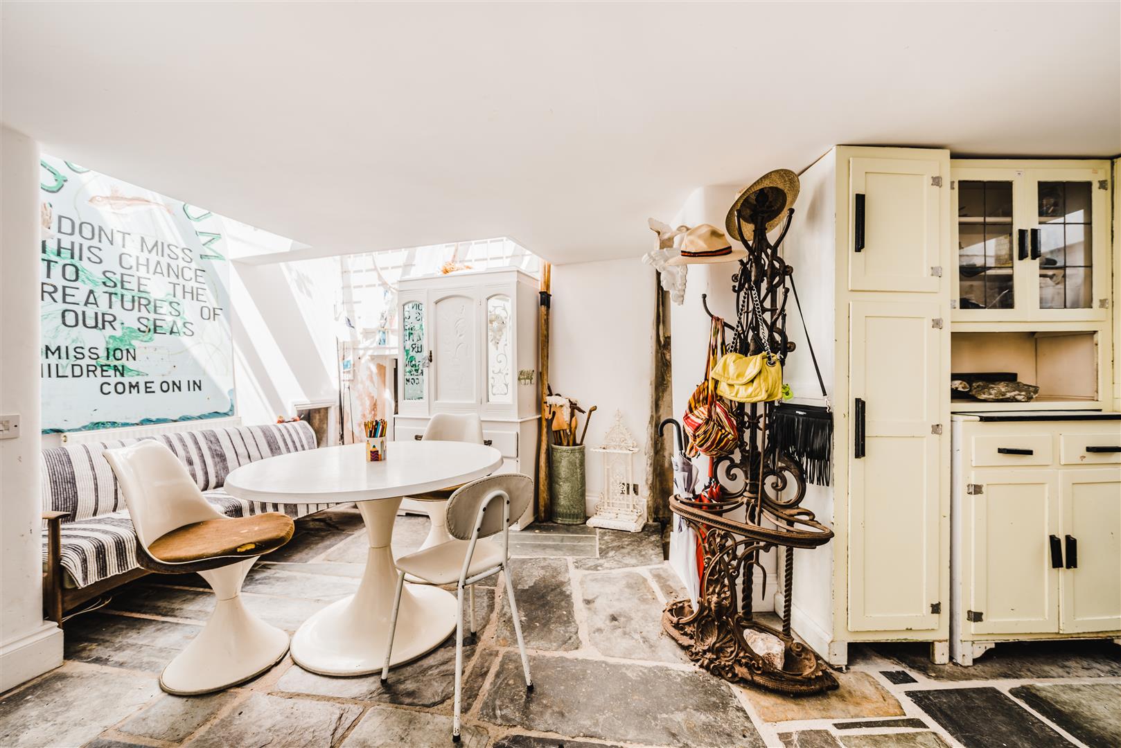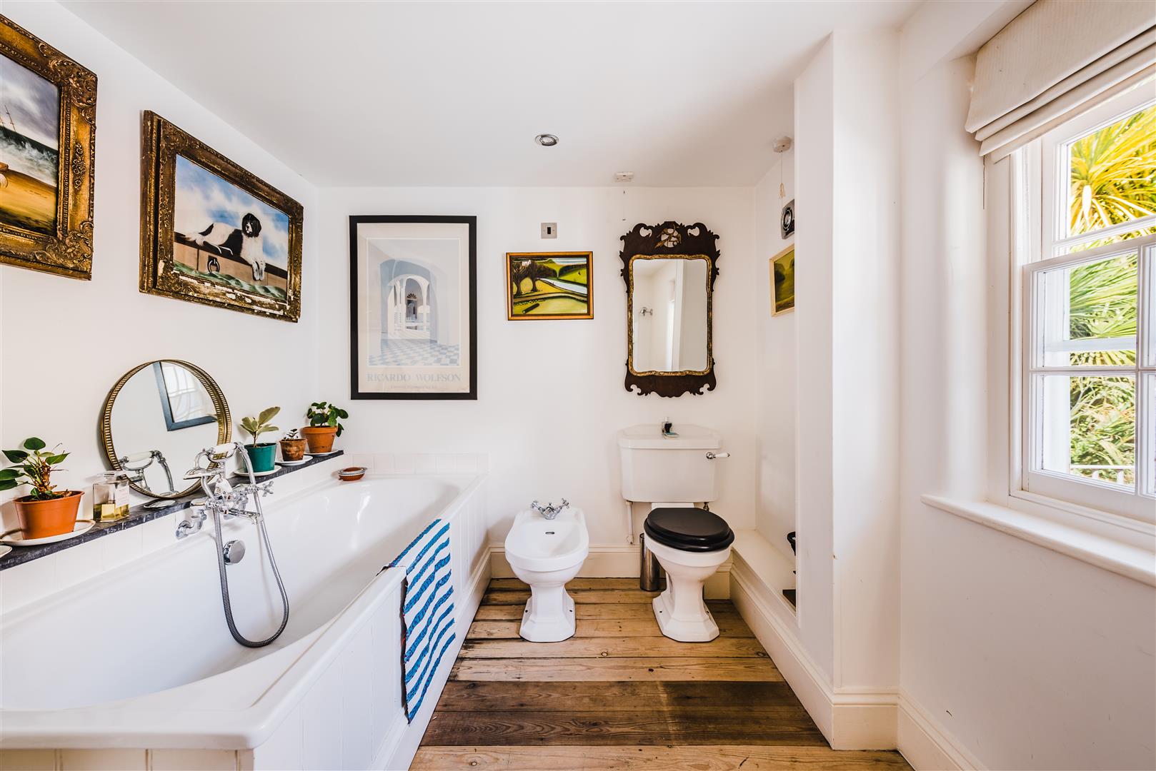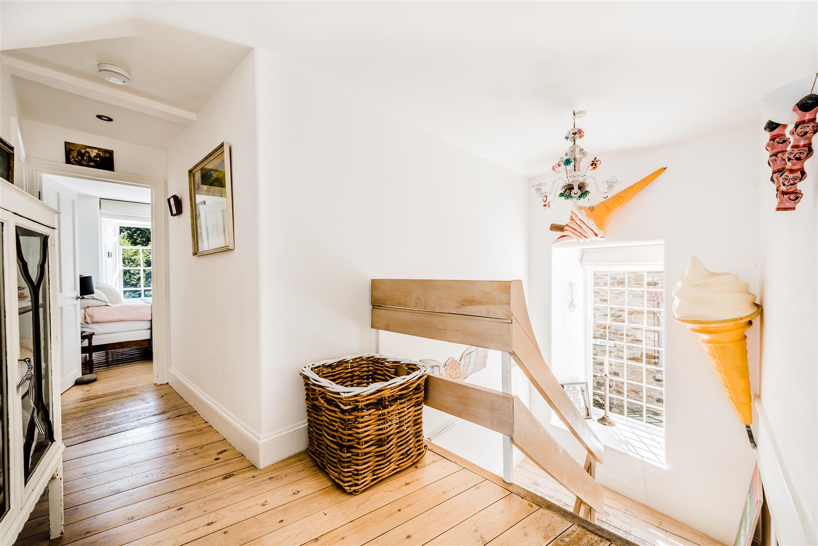 Steps rise up to the snug area, where the staircase also rises up to the bedrooms on the first floor. From the snug, there is a cloakroom/WC at the back of the house and a garden room with slate-flagged floor. Doors from the garden room give access to the basement utility room and a further cellar store.
