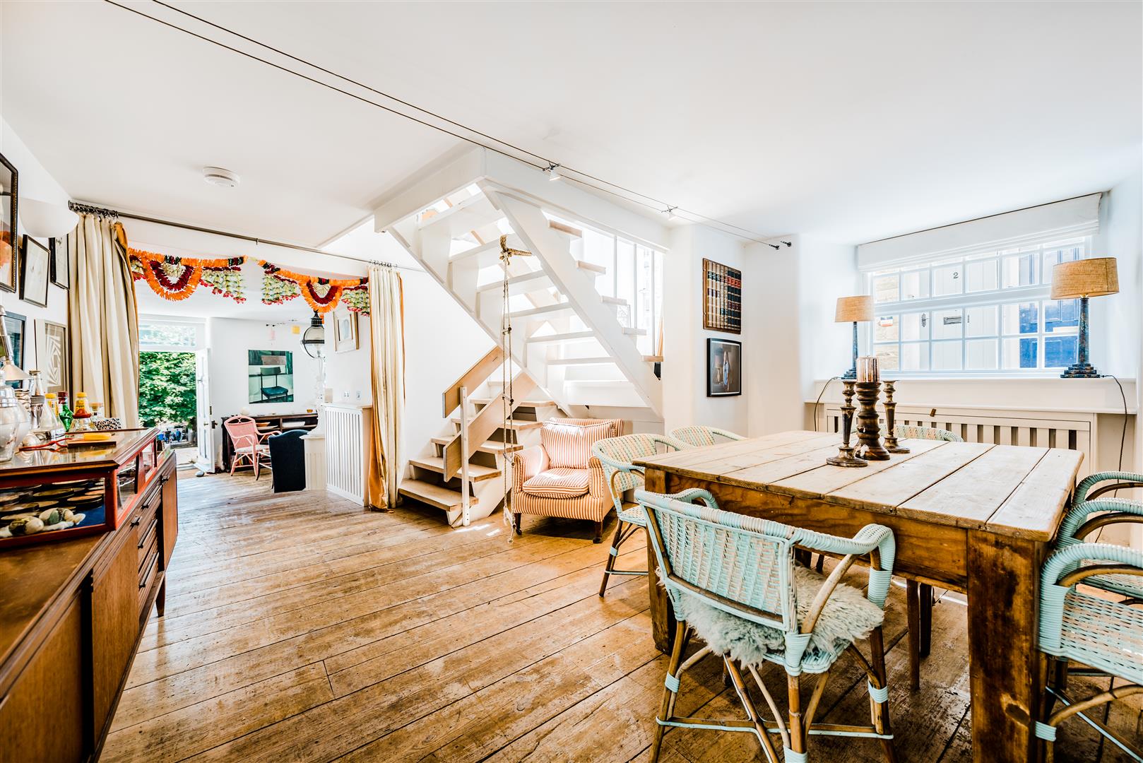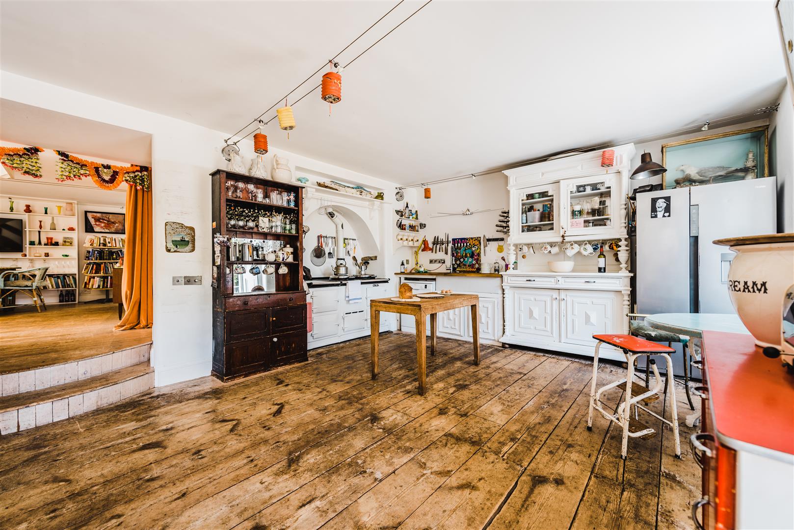 The Tour - One enters the house into a fabulous open-plan living room spanning the width of the house. There are wooden floors and sash windows with window seats overlooking the tree lined Church Avenue. At one end of the room is a sitting area with wood burner on a slate hearth, while at the other is a four-over gas-fired AGA.