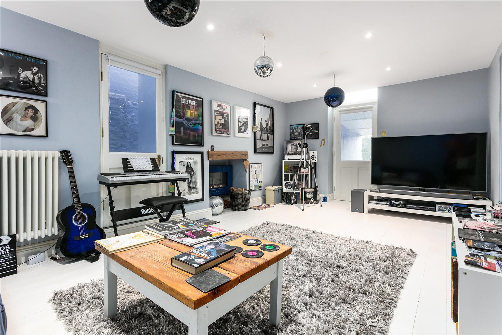 Stairs decend from the lounge to the lower ground floor, which has been set out as an excellent music room but it could be used for a multitude of other uses. The feature of the room is the retro Smeg electric fire that is in situ within the fireplace. There is a door on the southerly aspect that opens out to the lawned garden level and a further door opens in to an internal hallway that leads to a shower room and also houses a large utility cupboard that is fitted with Bosch appliances.