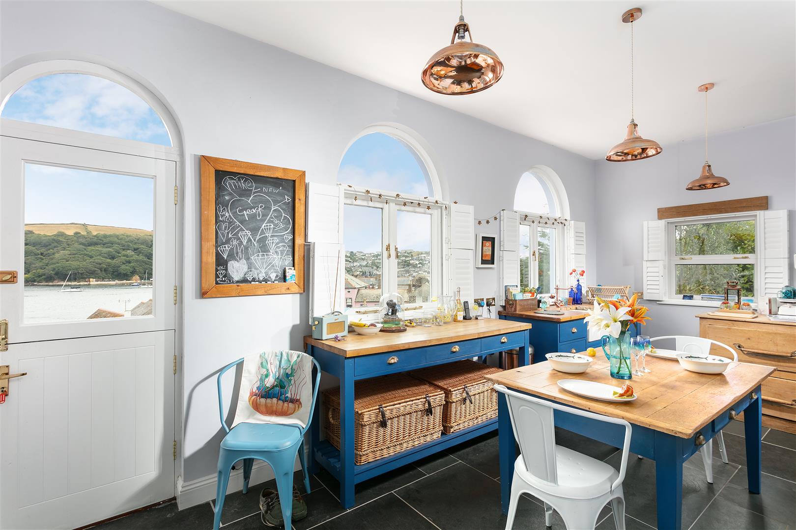 The stylish double aspect kitchen enjoys excellent southerly and westerly aspects over the town and harbour beyond from its arched casement windows. There is natural slate flooring with electric under floor heating under and it is fitted with a range of high quality freestanding styled painted kitchen units and Smeg appliances. There is also a stable door opens out on to the southerly outside terrace and a further door on the northerly side, opening to the front courtyard.