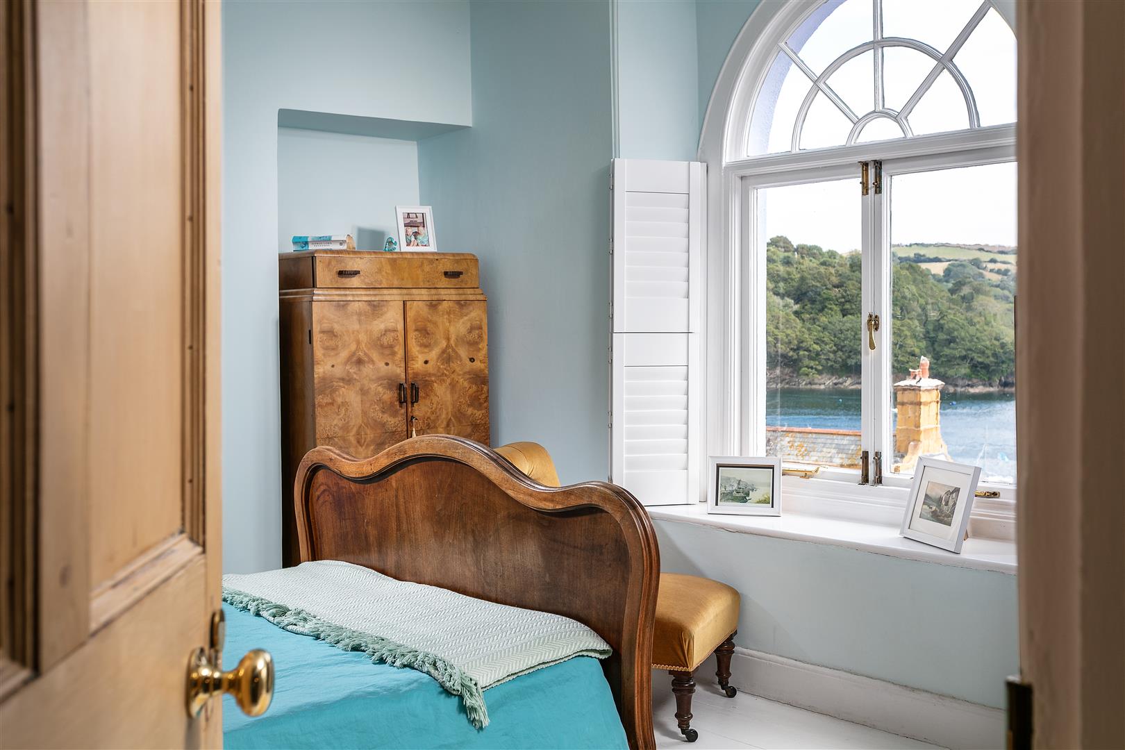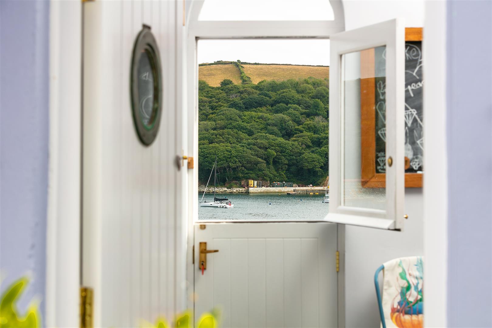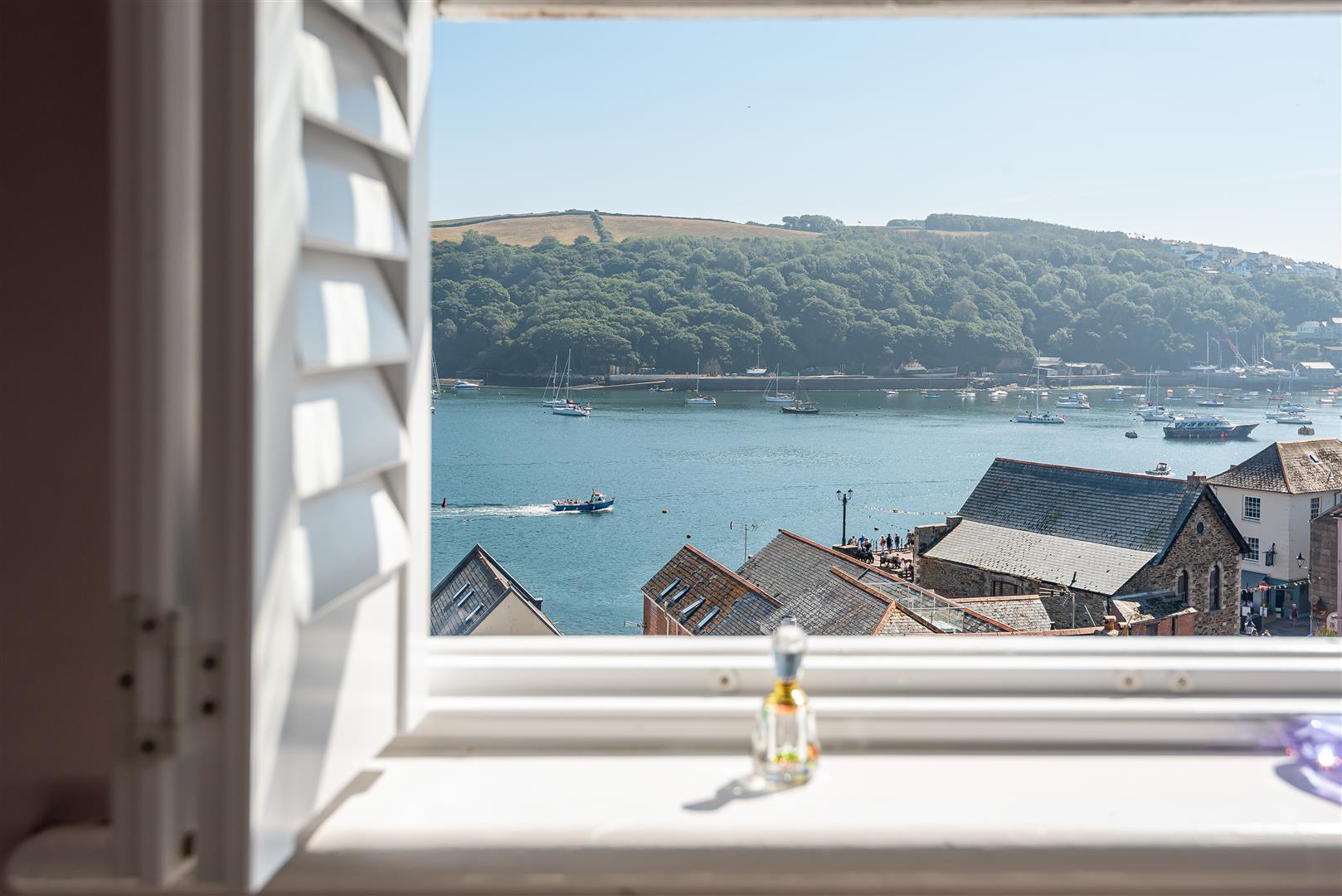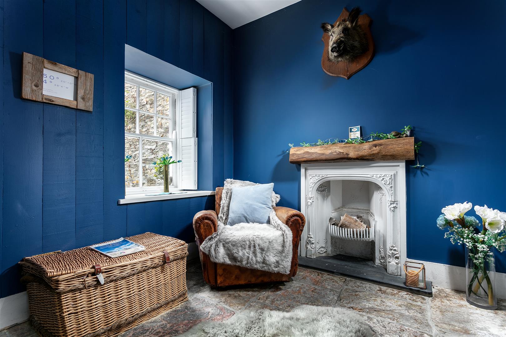 The spacious sitting room measures 19'1 x 11'5 and it too enjoys fantastic southerly views across the harbour via a fanlight casement window. The exposed painted floor boards continue in to this room and there is also a white painted ornate fireplace. French double doors connect to the lounge and a second door opens into a small adjoining room where the hot water cylinder and gas boiler are located.