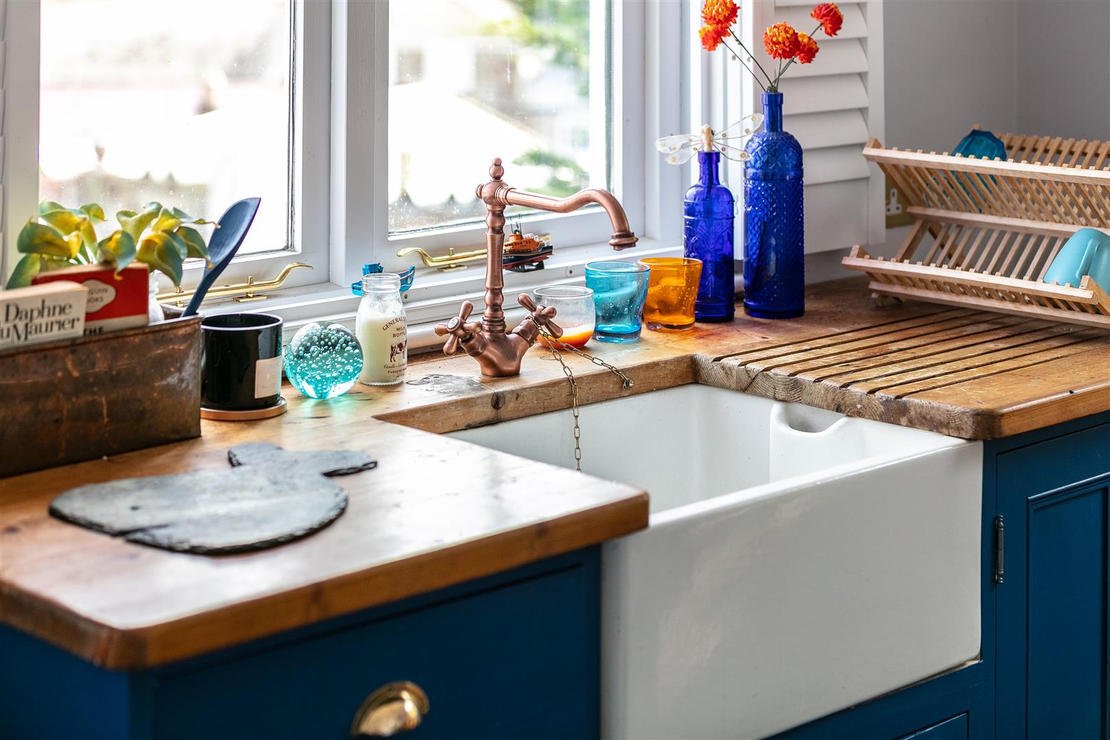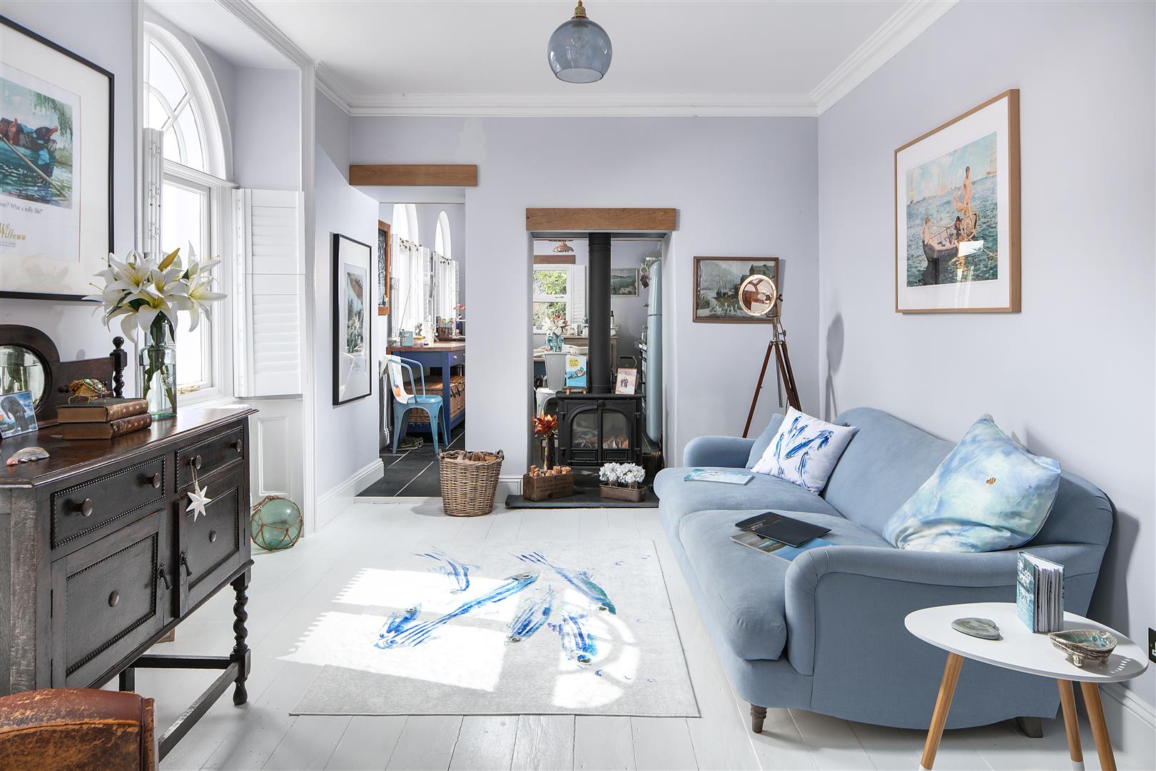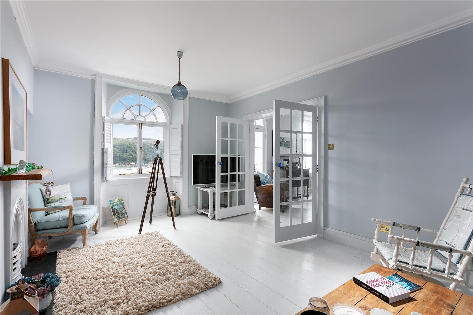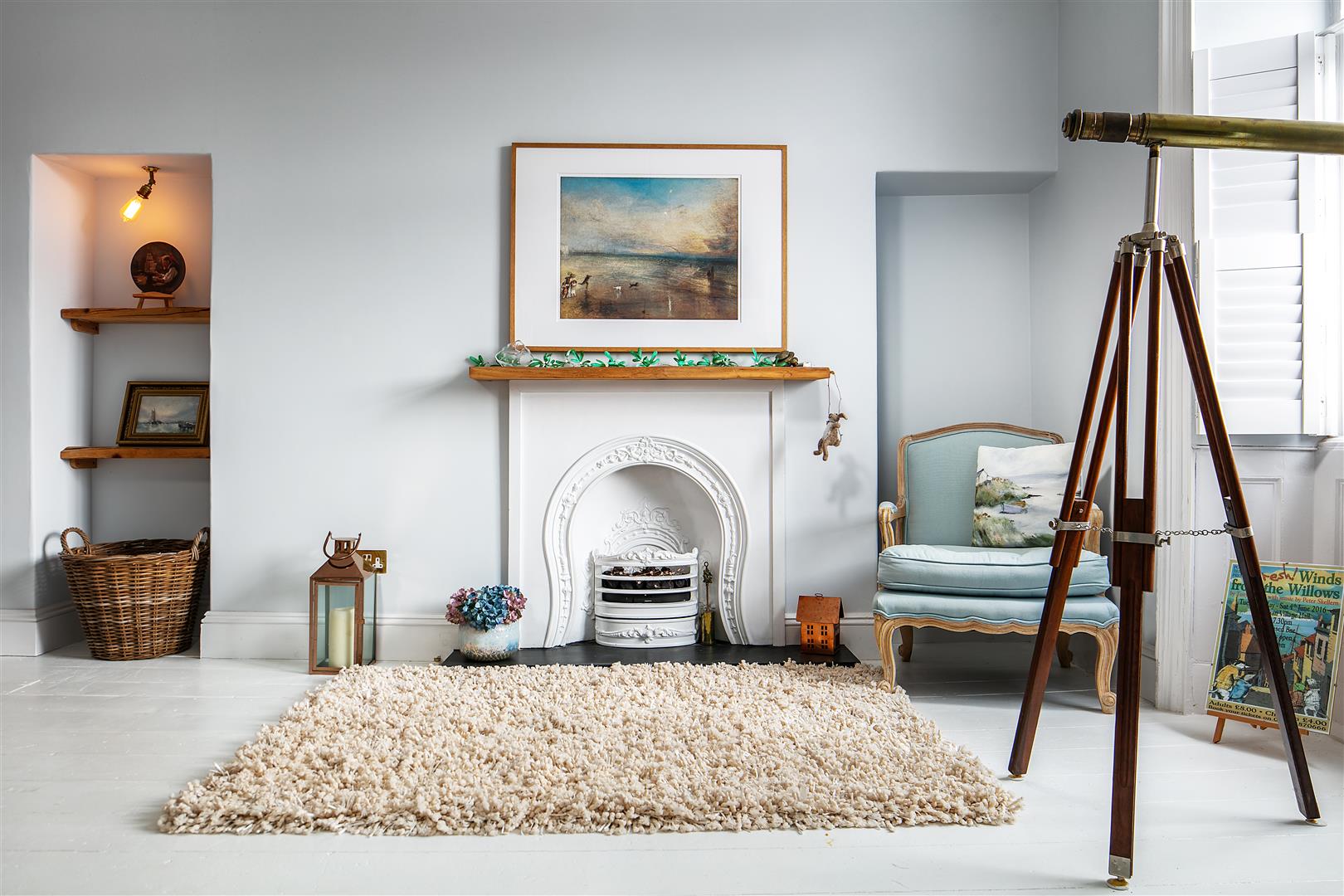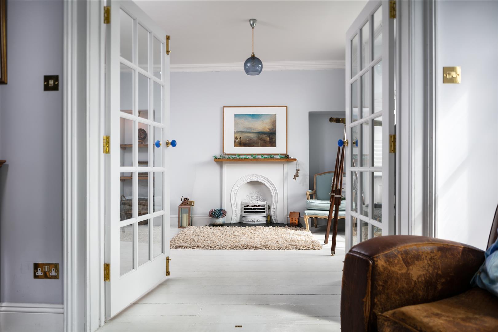 The entrance to the property is via a particularly welcoming boot room that could also potentially be used as office. This delightfully cosy room has been painted in a calm navy colour scheme and enjoys one of the ornate fireplaces. Th boot room opens through in to the central lounge that enjoys excellent river views from its fanlight casement doors and a second fanlight window, that are both located on the southerly aspect. This delightful room is a stunning introduction to the the main living rooms due to its high ceilings, exposed whitewashed floor boards and the feature back to back wood-burner that is positioned between the the lounge and the kitchen and at its opposite end are glazed French doors that lead in to the sitting room.