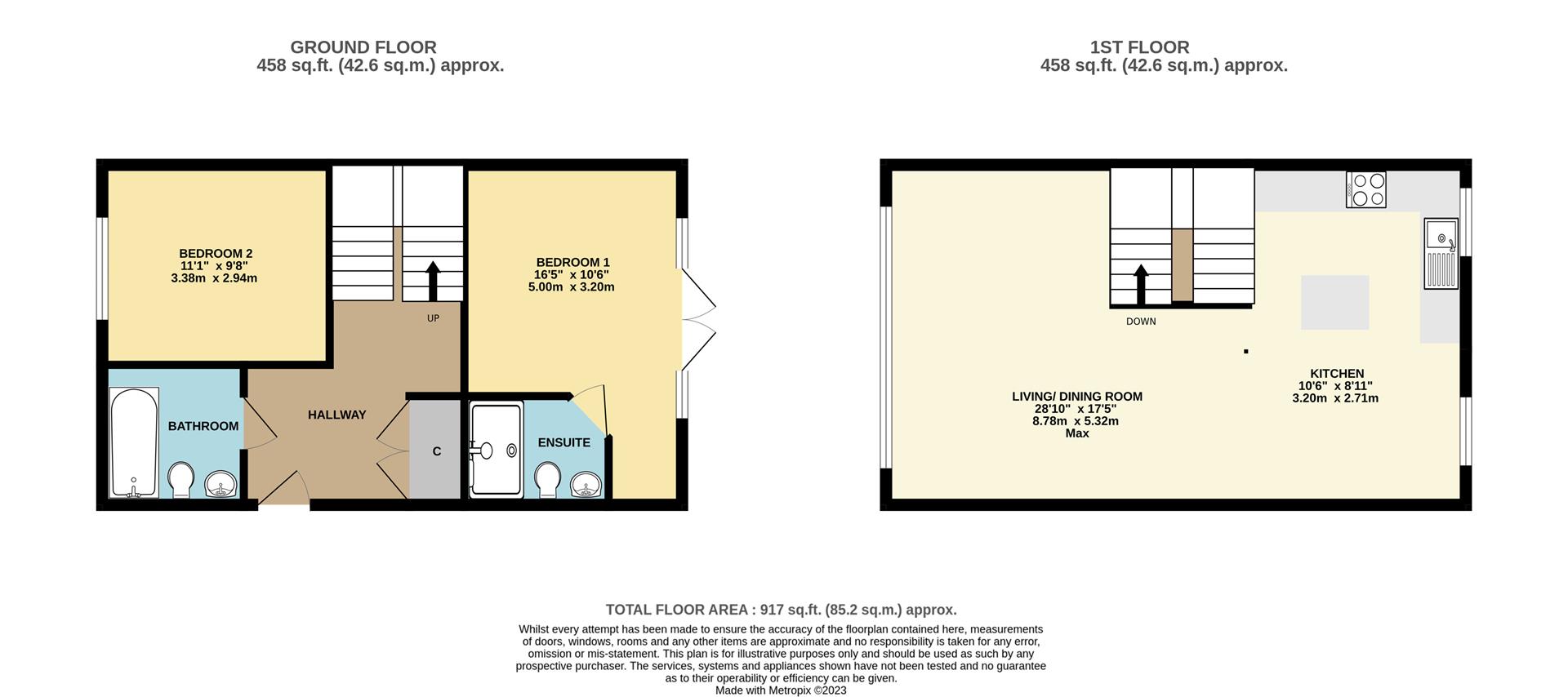 The front door opens to the entrance hall, with useful storage cupboard to one side and a further cupboard with space and plumbing for washing machine and further storage space. A door opens to the principal double bedroom with elegant ensuite shower room, build in cupboards, and double doors open to the rear paved courtyard. There is a further double bedroom, currently configured as a twin which has use of the family bathroom, with panelled bath and shower over. Stairs lead to the first floor with a useful storage area underneath.
