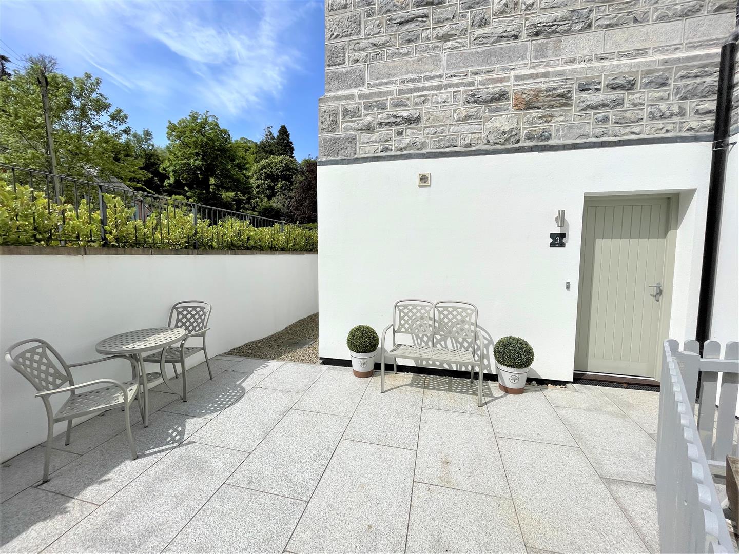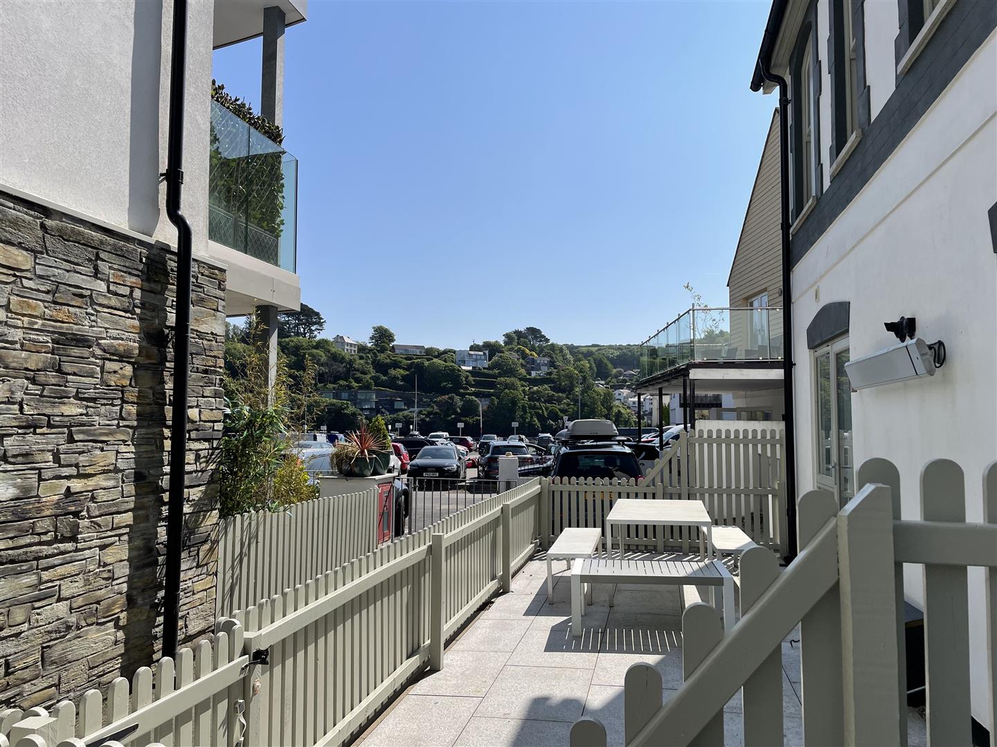 The property is accessed via an pedestrian walkway from the car park. The front terrace is enclosed by painted wooden fencing and there is an area of gravel to one side, a useful storage space.