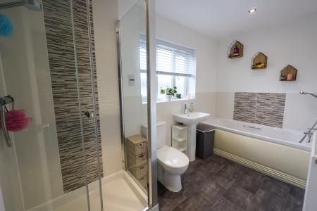 12' 0" x 5' 6" (3.66m x 1.68m) Fitted with a panelled bath with shower mixer attachment a separate shower cubicle with mains shower, low level W./C. wash hand basin, partially tiled walls, low voltage lighting, window to the front, shaver socket.