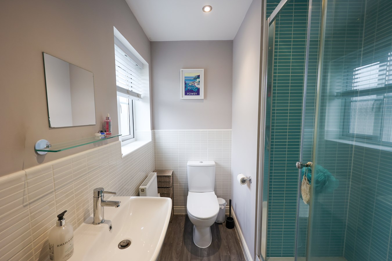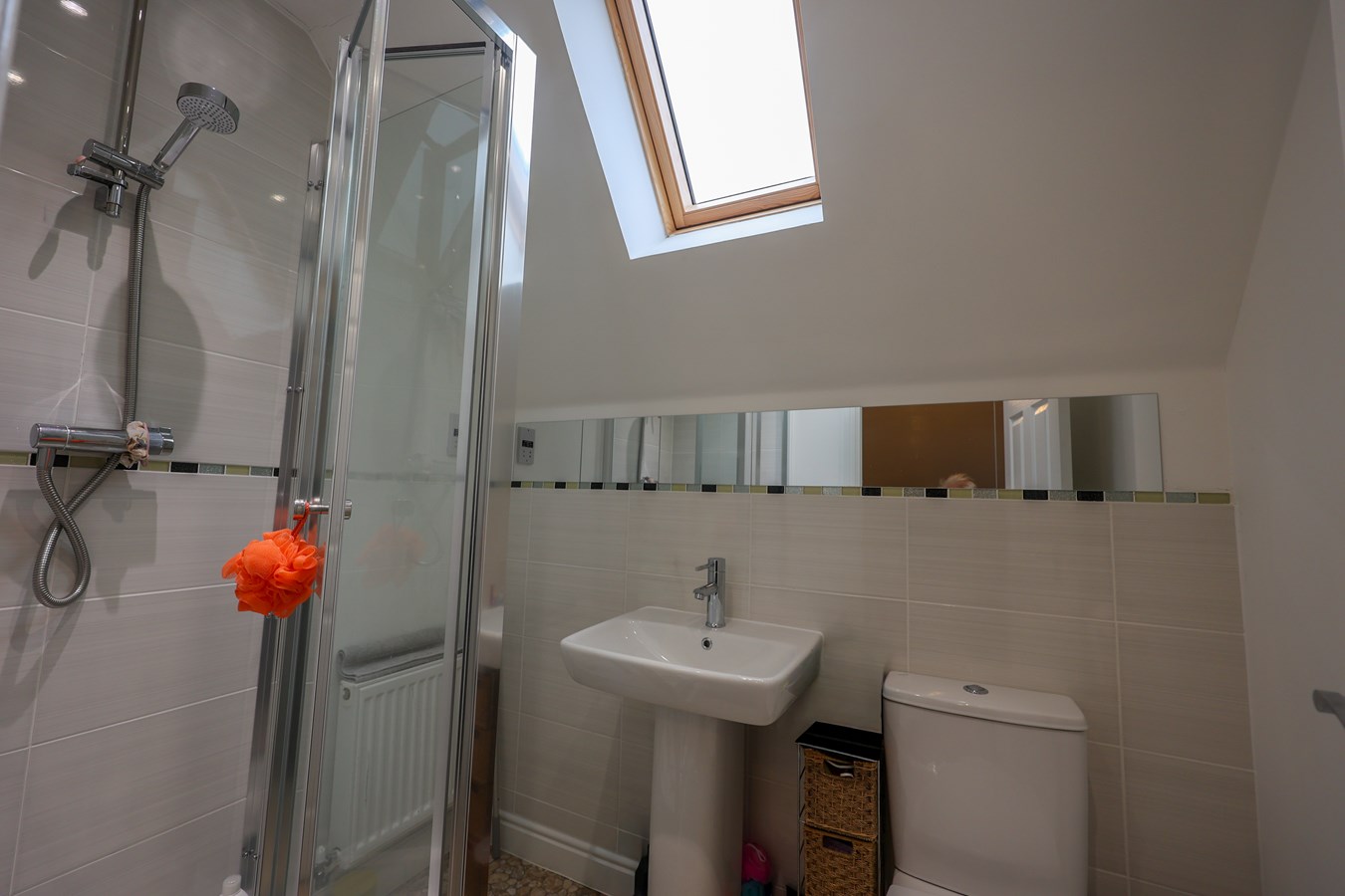7' 0" x 4' 7" (2.13m x 1.40m) Fitted with a mains Mira shower, low level W.C. wash hand basin, partially tiled walls, skylight window to the rear.