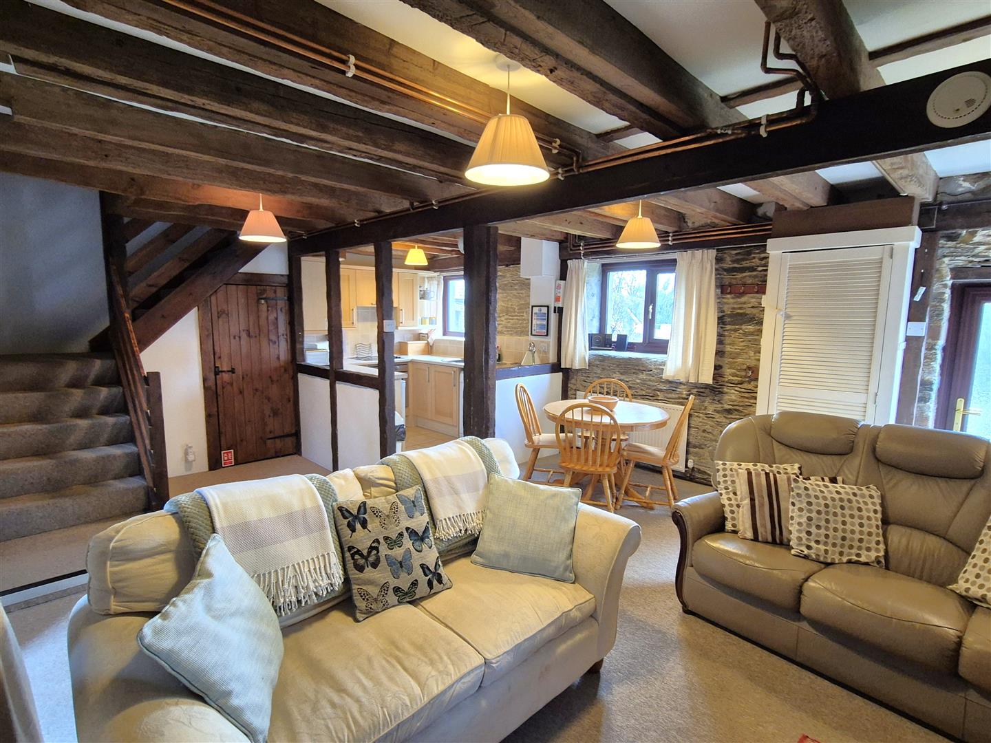 The front door opens directly into the open-plan living area, which has a warm and welcoming feel and is full of cottage character. An ornate stone fireplace is the focal point of the sitting room, which currently houses an electric wood effect fire. There is plenty of space for a dining table and chairs. A cupboard near the front door provides storage space and is home to the gas boiler. A very useful cupboard under the stairs is great for storing away cleaning equipment. A door opens out to the rear garden terrace.