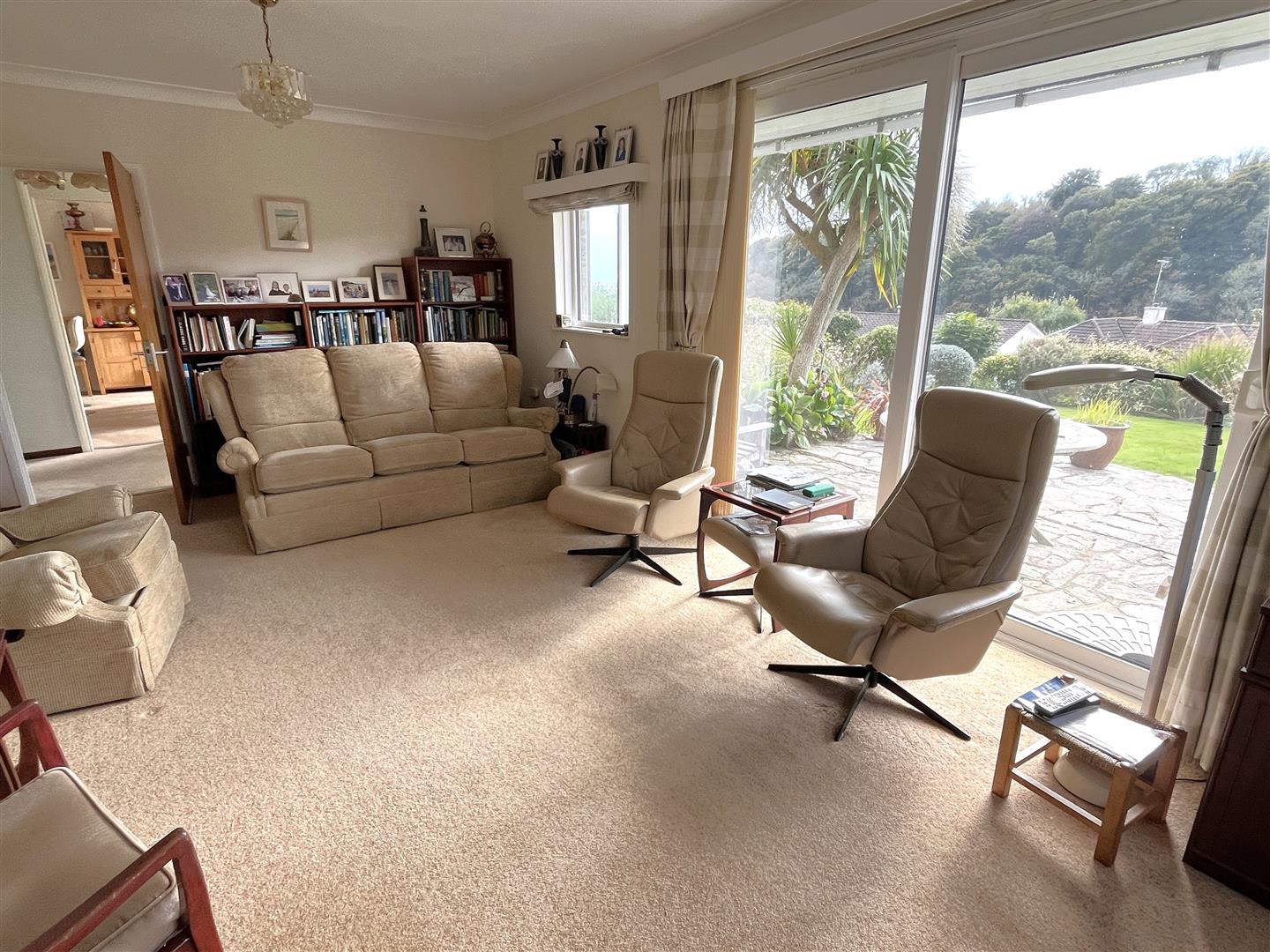 To the other side of the entrance hall, a door opens to the sitting room, with large sliding door to the front patio and garden. There are further windows to both the front and side elevation.