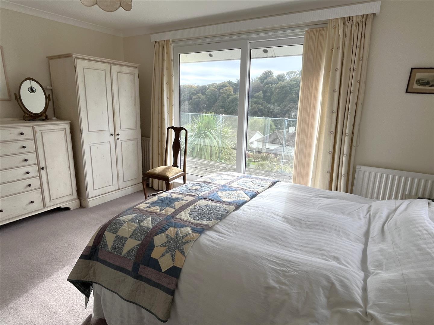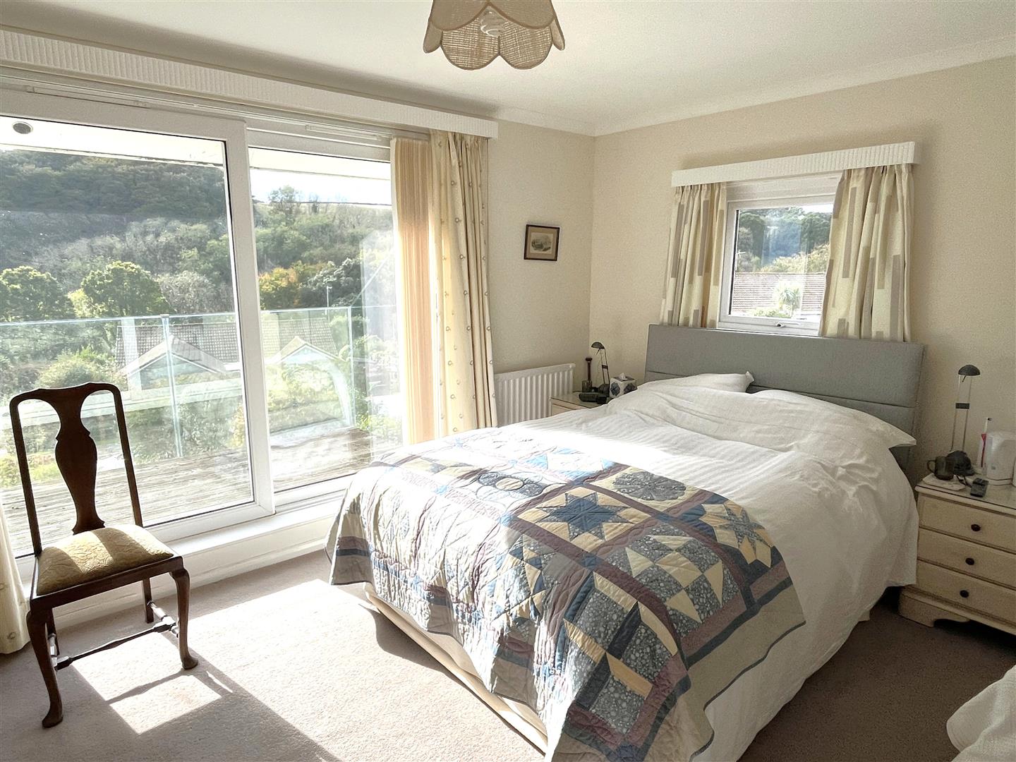 The principal bedroom is a good size with sliding door accessing the balcony and lovely views to the neighbouring woodland and out to sea. There is a useful storage cupboard/wardrobe and a further door opens to the en suite with large shower cubicle, WC and wash basin.
