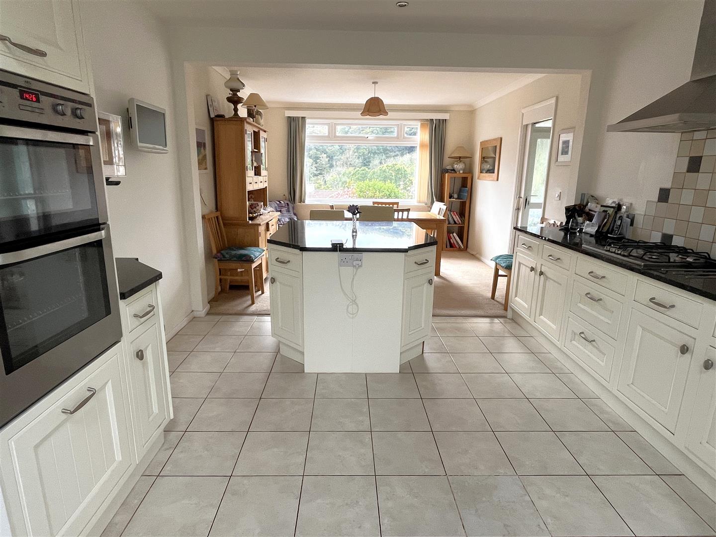 The well appointed "L" shaped kitchen has a tiled floor and range of base and wall units containing an AEG double oven, gas hob and integrated dishwasher. There is space for a washing machine and tumble dryer. A door opens to the rear patio and a further door leads into the generous sized single garage.