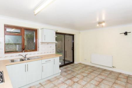 Kitchen/Breakfast Room - 4.80m x 3.89m (15'9" x 12'9") - Range of fitted base and wall units. Roll edge work surfaces with complementary tiled splash backs. Fitted oven and four ring gas hob. Electric oven. Stainless steel one and a half sink and drainer. Space for upright fridge/freezer. Space and plumbing for automatic washing machine and dishwasher . Wall mounted gas fired combination central heating boiler. Larder cupboard. Tile effect laminate flooring. Sliding double glazed patio doors leading out to the rear garden. Radiator. Glazed door leading out to the side access. Double glazed window to the rear elevation. Television point. Double Doors to:-