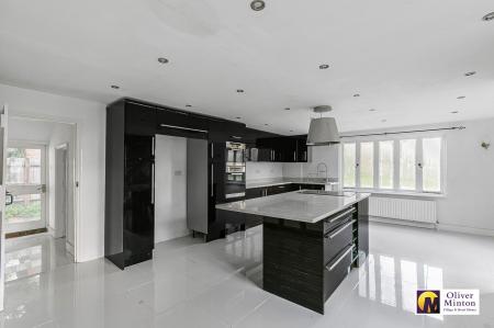 Porcelain tiled floor. Dual aspect with double glazed windows to rear and two sets of double glazed French doors to rear garden. 4 radiators. Central island granite quartz work surface and breakfast bar with inset AEG electric induction hob with soft-closing drawers. Further matching granite work surfaces incorporating sink unit with waste disposal. Fitted wall and base units and pull-out carousel unit. Recess for large fridge/freezer. Integrated Miele dishwasher. Inset ceiling lights. Exposed beams. Door to: