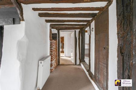 Staircase to first floor Exposed beams. Radiator. Door to recessed storage cupboard. Door to: