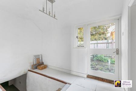 Stairway opening with stairs down to Basement Room. Porcelain tiled floor. Glazed door to rear garden. Door to Utility Room.
