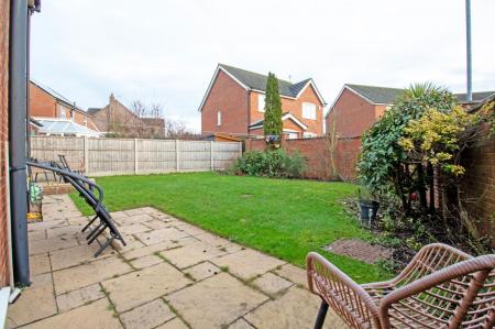 Externally, the property occupies a desirable corner plot with a wrought iron fence enclosing a lawned frontage. A block-paved driveway provides ample off-road parking and leads to a detached garage, with the added benefit of an EV charging point conveniently located near the drive. To the rear is a generous enclosed garden, predominantly laid to lawn, featuring two separate paved patio areas ideal for outdoor dining and entertaining.