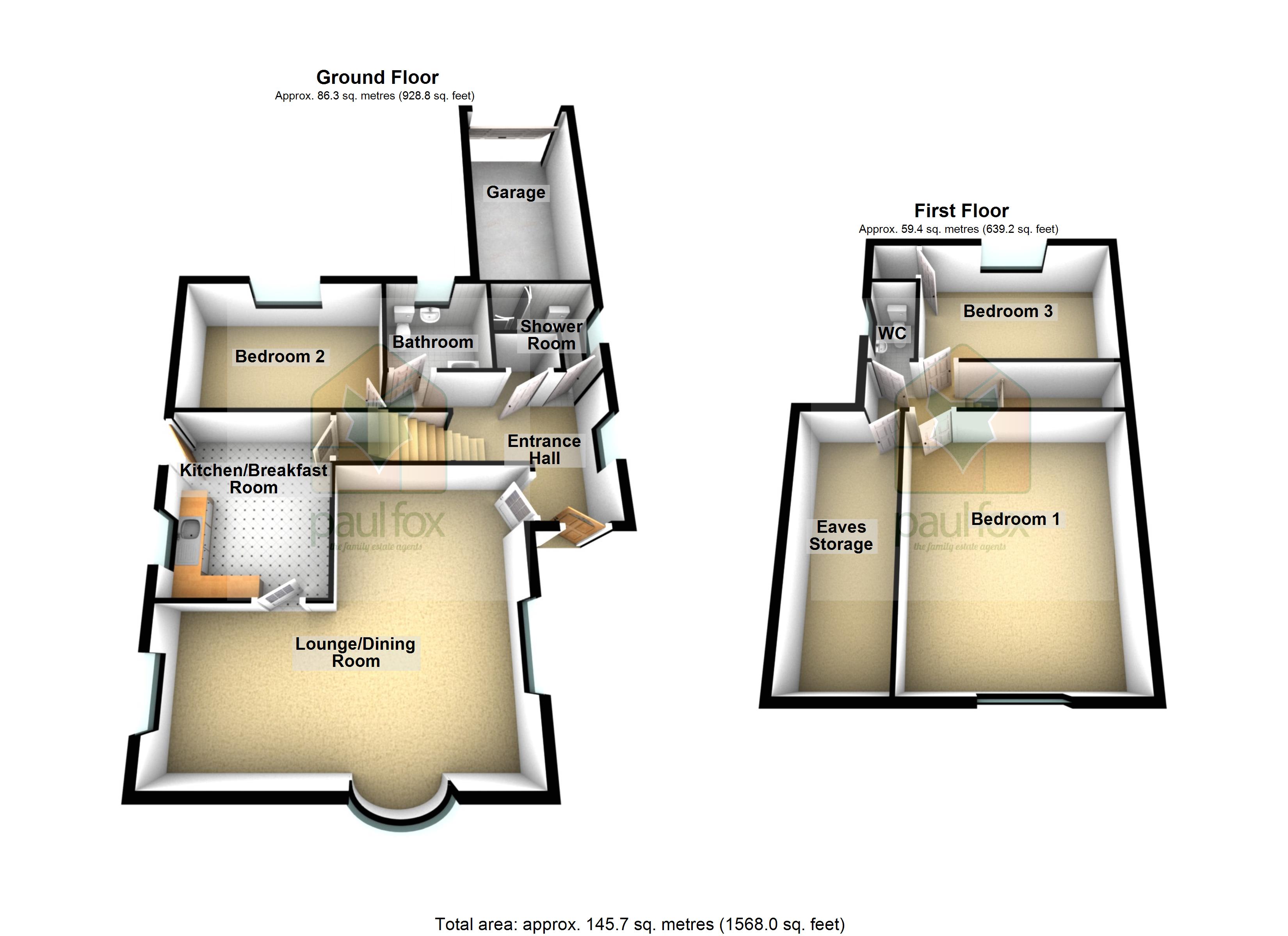 The first floor offers two further double bedrooms, eaves storage and a separate WC.