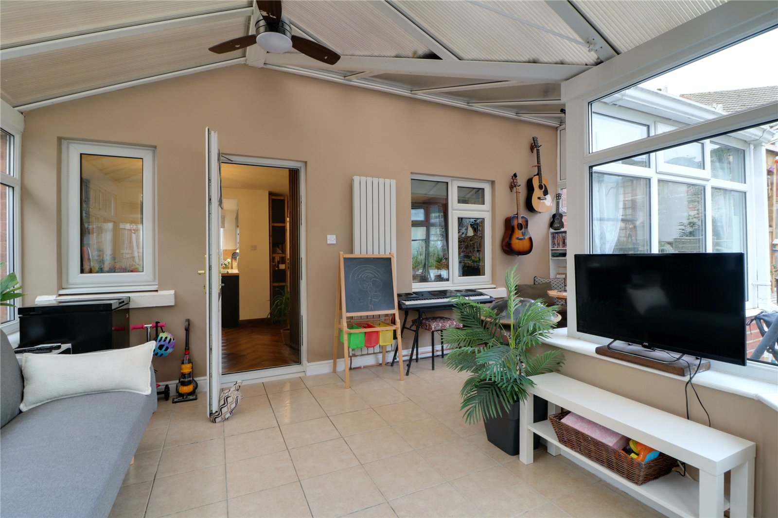 Conservatory 12'8" x 17' (3.86m x 5.18m). With a lean to and hip and pitched polycarbonate roof, fully tiled flooring, surrounding uPVC double glazed windows with two twin rear French doors allowing access to the rear patio, TV input and full power.