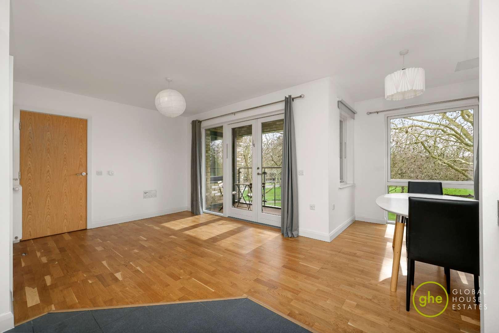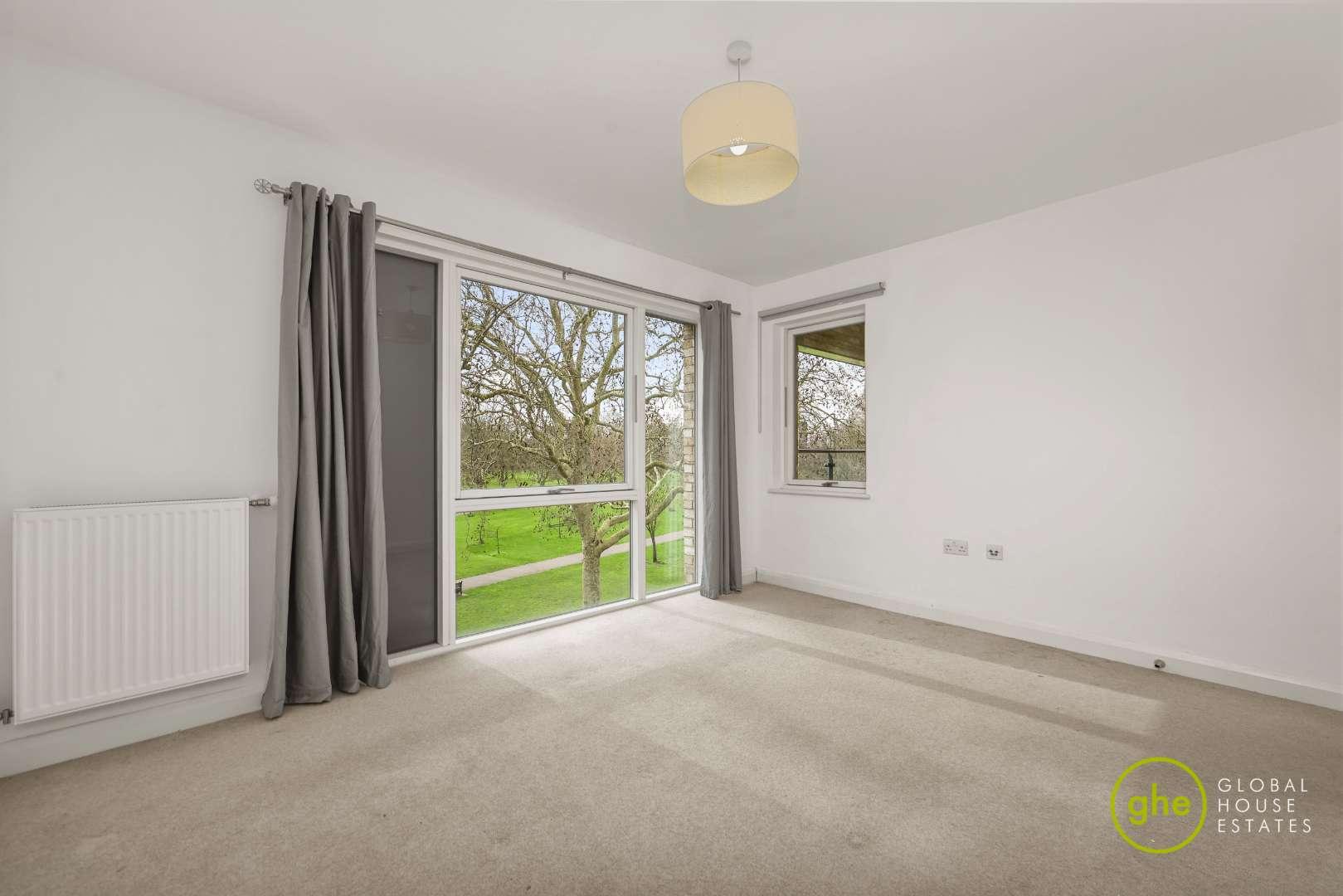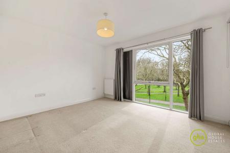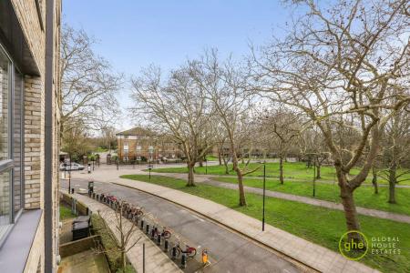The lounge opens onto a private covered balcony, offering a peaceful outdoor space with pleasant views towards Well Street Common. The stylish kitchen is fitted with integrated appliances.