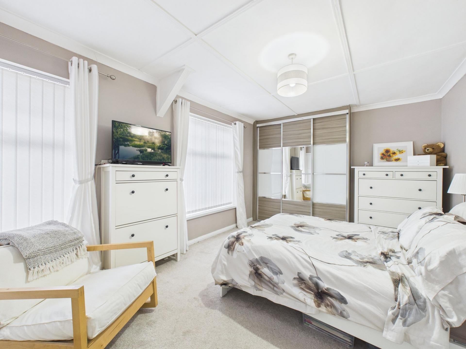 To the first floor, there are two well-proportioned bedrooms. The main bedroom benefits from a modern set of sliding fitted wardrobes, offering excellent storage. The second bedroom is also a good size and would make an ideal children’s room, guest bedroom, or home office.