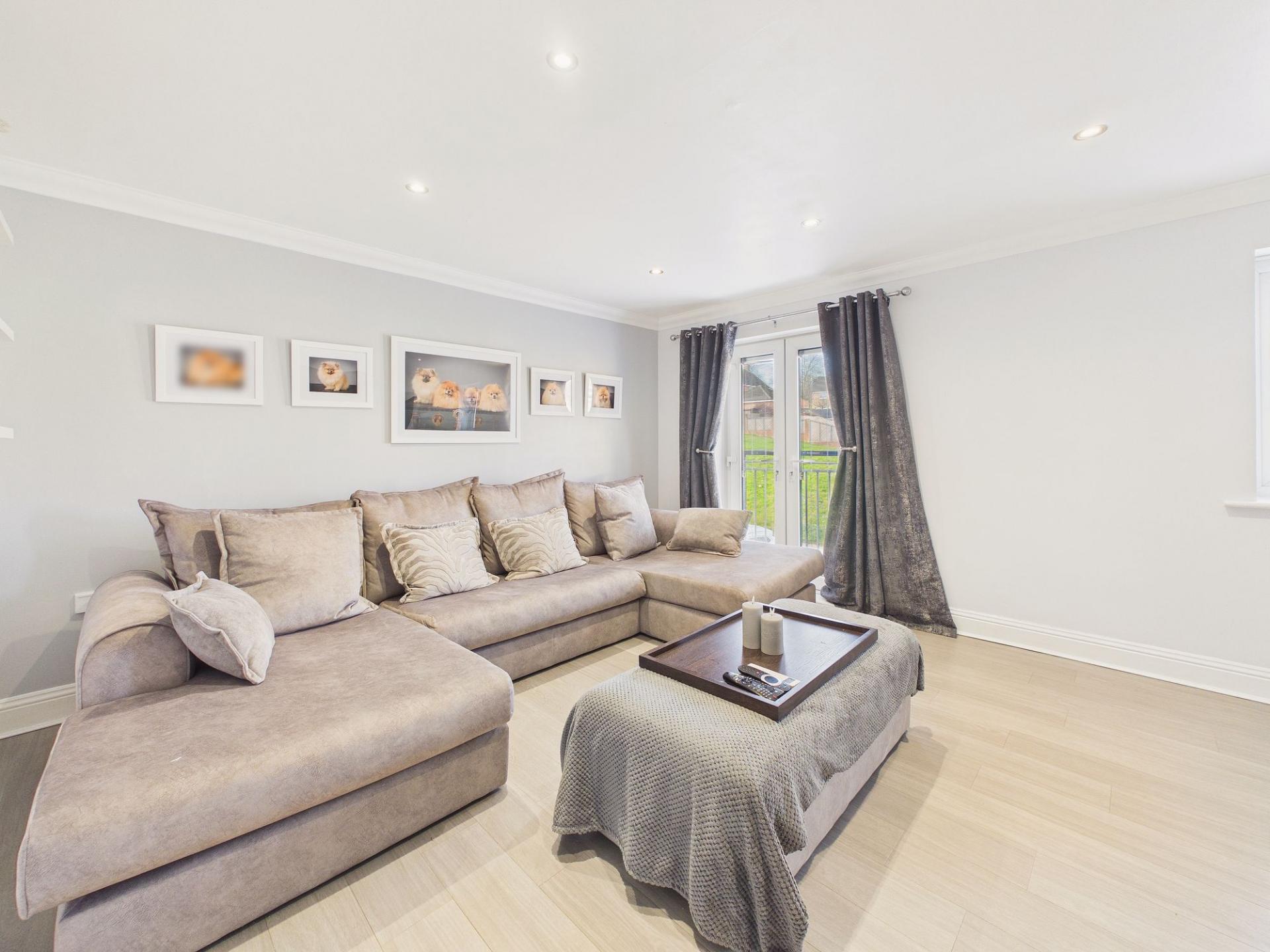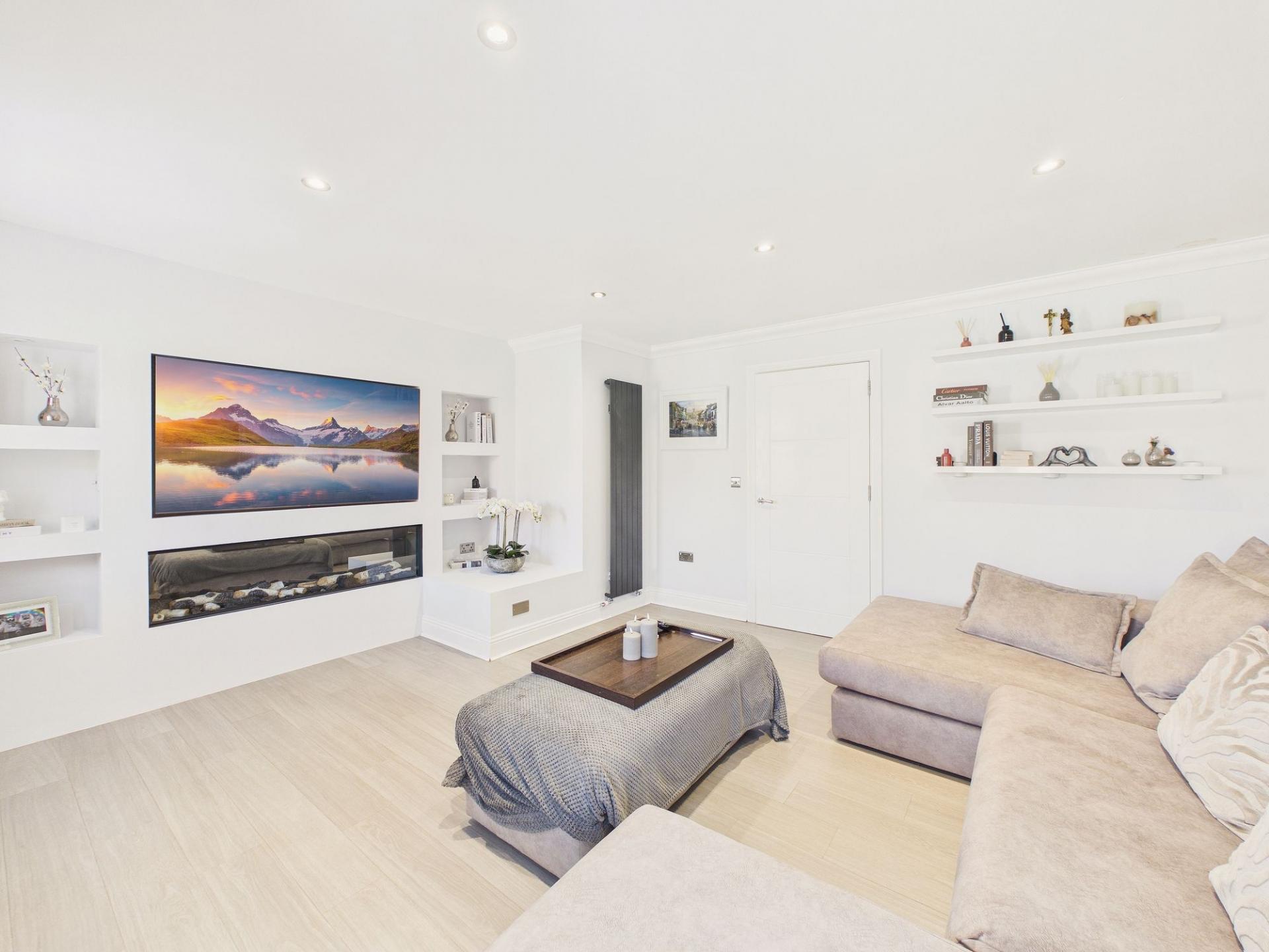 The first floor presents a formal lounge that exudes elegance, featuring a built in media wall with an inset fireplace and recessed shelving, perfect for display or storage. Patio doors lead to a Juliet-style balcony, enhancing the sense of light and space. Two well-appointed bedrooms are also located on this floor, offering flexible accommodation.
