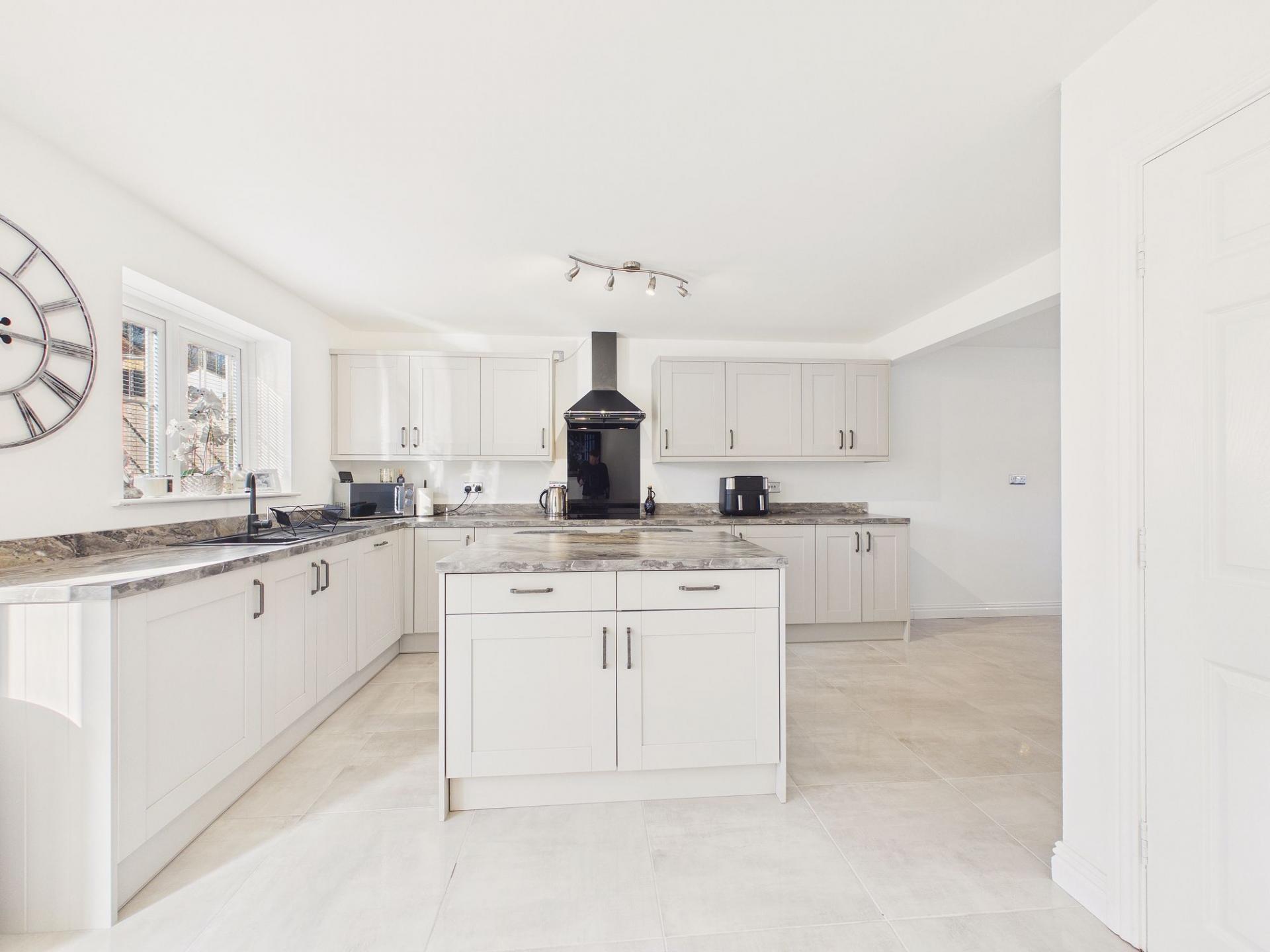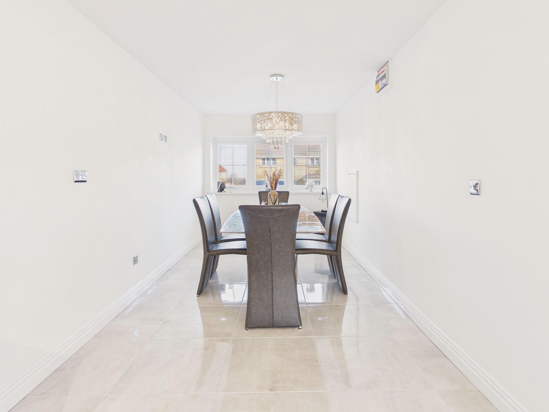 Upon entering, you are greeted by a welcoming entrance hallway, leading to a convenient downstairs WC and the heart of the home, a fabulous fitted kitchen at the rear of the property. This modern kitchen features a stylish range of units, built in cooking appliances, and a central preparation island complete with a breakfast bar, ideal for casual dining or entertaining. Patio doors open directly onto the rear garden, providing seamless indoor-outdoor living. The kitchen flows effortlessly into a spacious dining area, positioned to the front aspect, creating a perfect setting for family meals and gatherings.