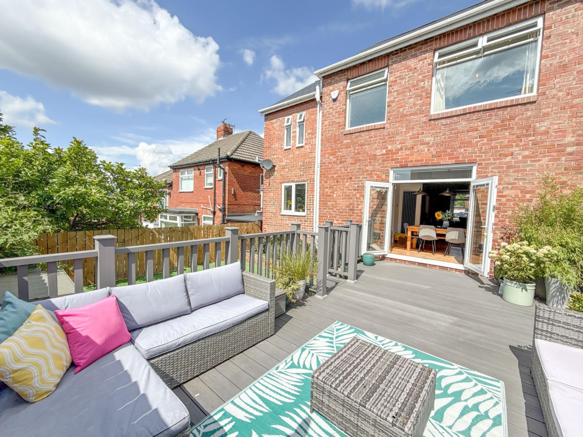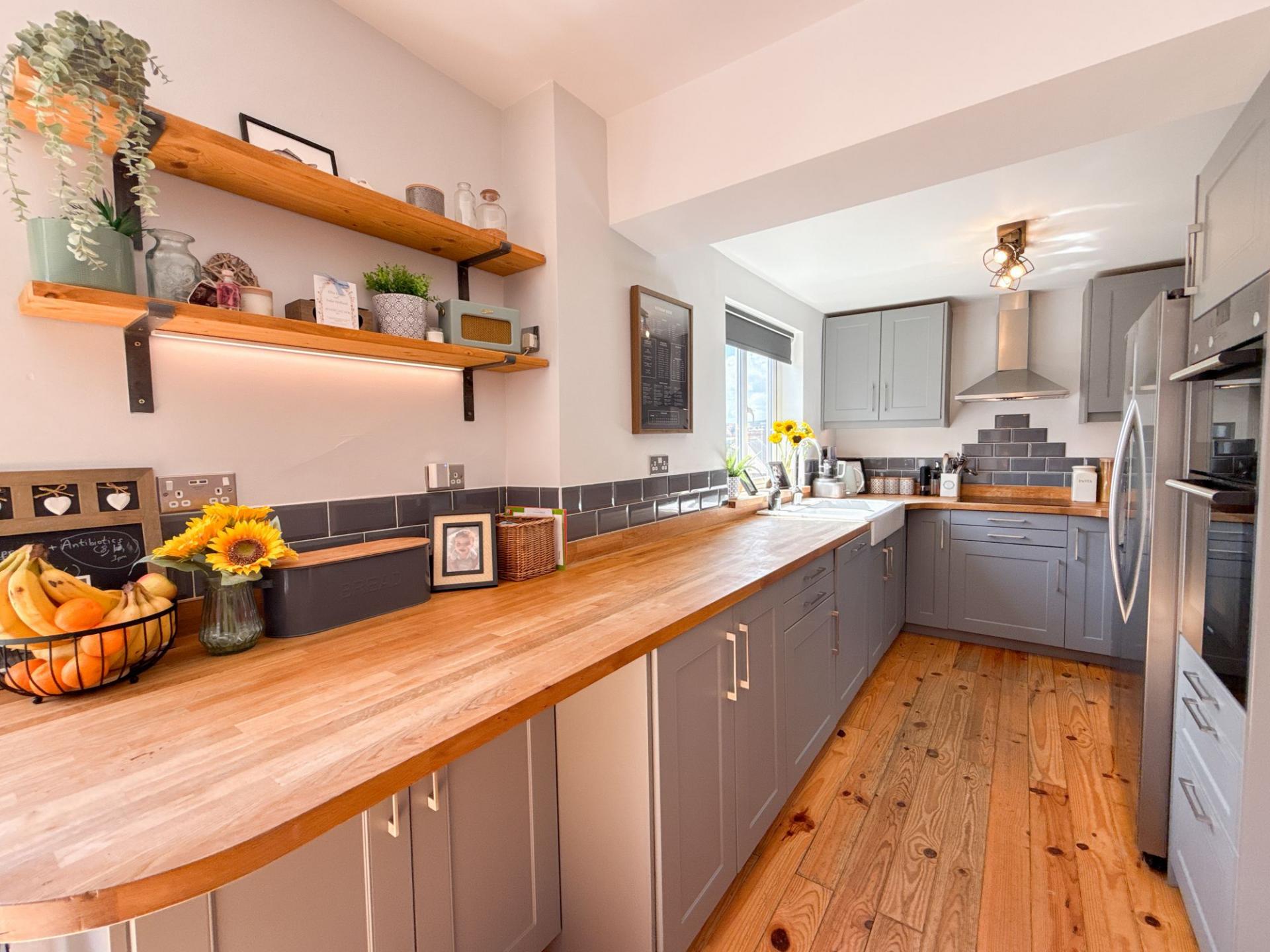 The dining area is a showstopper in its own right, complete with a charming exposed brick chimney breast housing a stylish electric log burner-style fire, adding a touch of rustic charm. Patio doors provide a seamless connection to the outdoors, opening onto a spacious, elevated decked sun terrace – perfect for alfresco dining and summer gatherings.