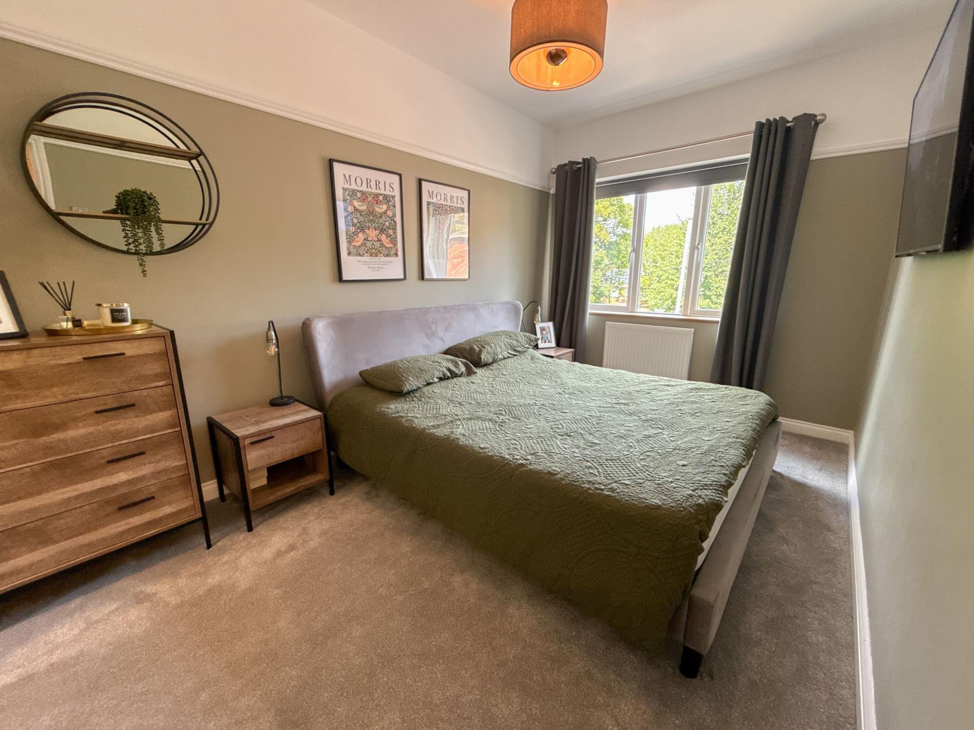 Two further bedrooms, both tastefully decorated, share access to a luxurious family bathroom. This serene space features a roll-top bath with a mains-fed rainfall shower over, combining indulgence with practicality.