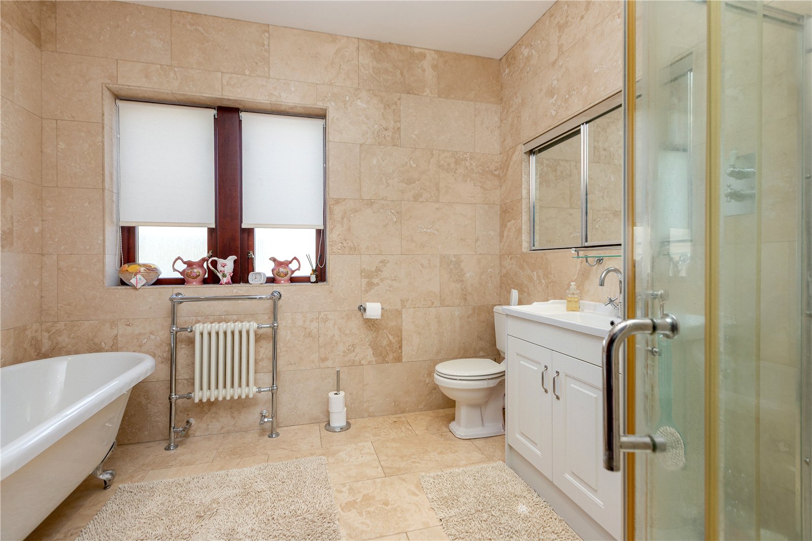 The family bathroom completes the accommodation and is fitted with a white suite comprising a WC, a wash hand basin set within a floor standing vanity unit, and a large shower cubicle and a freestanding roll top bath. Heated via a floor standing radiator, the bathroom is fully tiled.