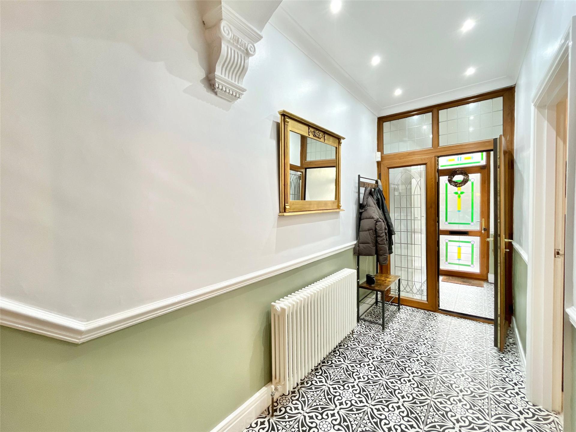 Entrance Hallway Featuring a traditional style central heating radiator, a tile patterned floor, dado rail, coving to the ceiling, recessed lighting, corbel archway and a period style bannister leading to the first floor with an understairs storage cupboard. a tiled pattern floor.