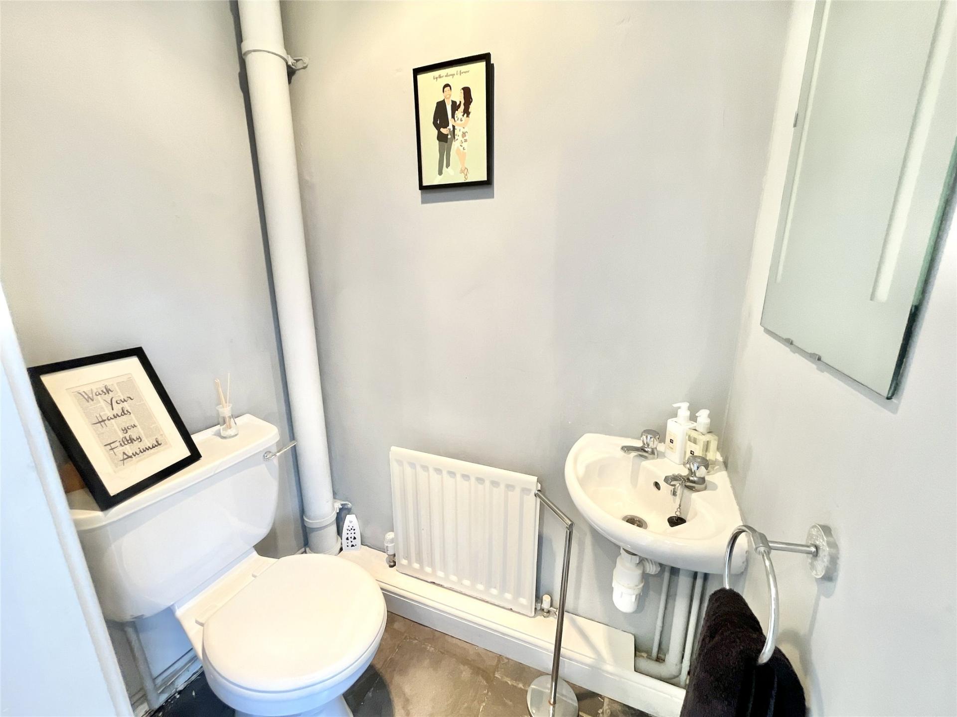 Guest Cloakroom/WC Equipped with a suite comprising: low level wc, wash hand basin, central heating radiator, tiled floor and recessed lighting.