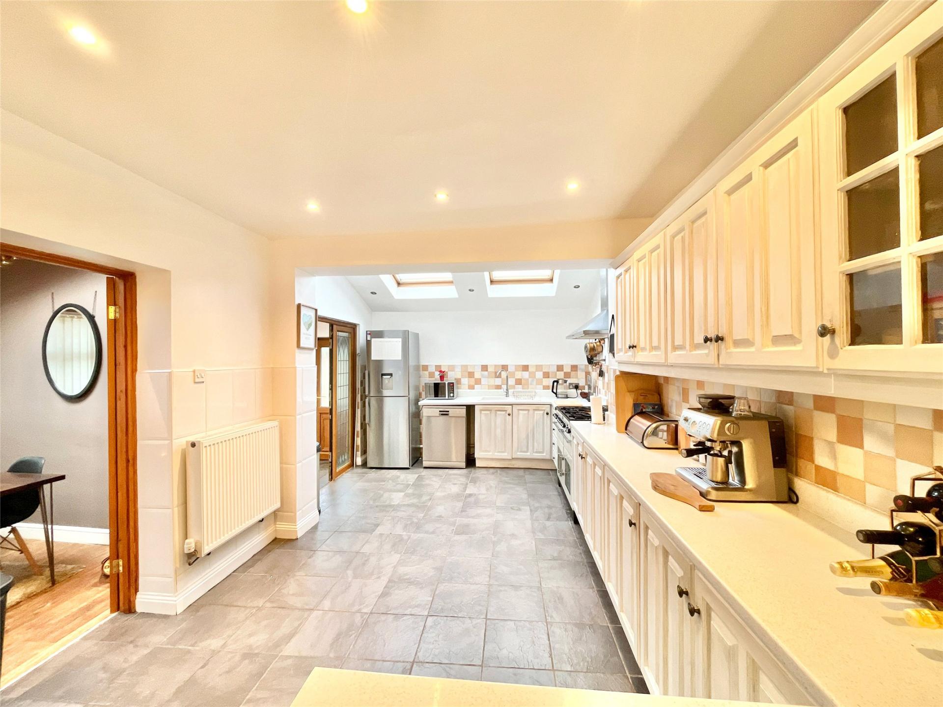 Dining Kitchen 33'8" x 10'7" (10.26m x 3.23m). An impressive open plan dining kitchen fitted with a range of wall and base units with work surfaces over, sink and drainer unit with mixer tap, recess for a range style cooker, chimney style extractor hood, recess for a freestanding dishwasher and fridge freezer, tiled splash backs, tiled floor, recessed lighting, two central heating radiators, double glazed window overlooking the rear elevation with Velux style windows and a door to the sun room and French doors. The kitchen area then opens to an additional dining area with a feature wall, laminate flooring and a central heating radiator.
