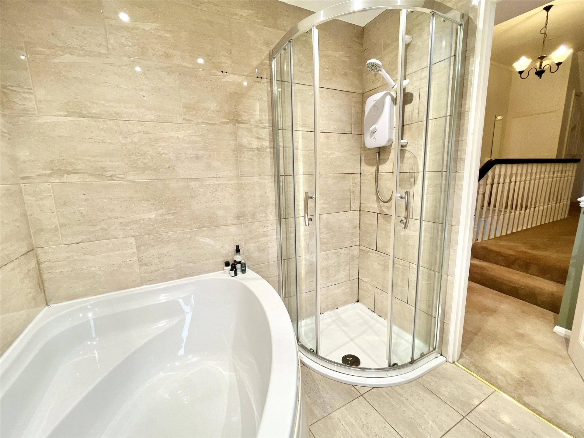 Family Bathroom Equipped with a stylish four piece suite comprising: corner panelled bath, corner shower enclosure, low level wc, wash hand basin, tiled walls, tiled floor, under floor heating, double glazed frosted window to the side elevation, illuminated mirror, heated towel rail, recessed lighting and an extractor fan.