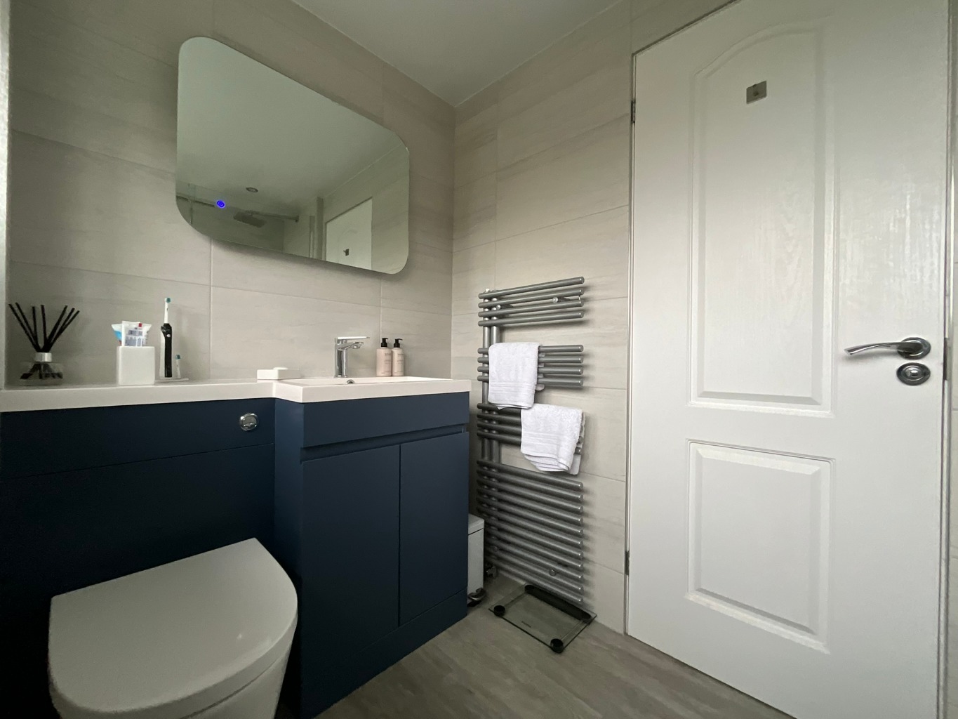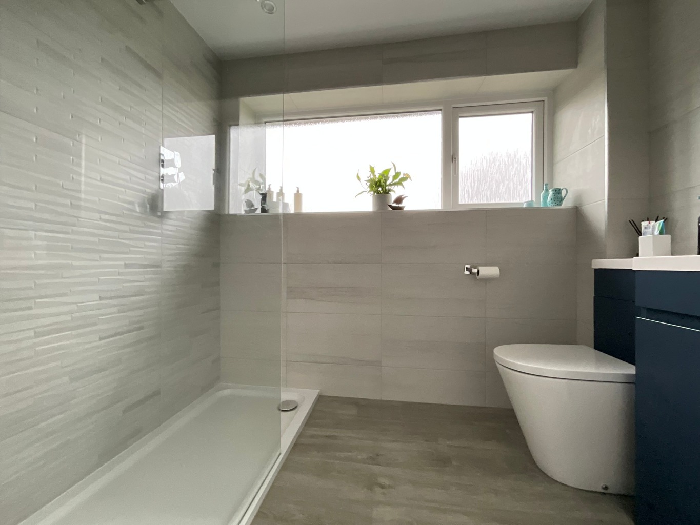 Bathroom (2.36 x 1.61)Features: UPVC double glazed window, low level WC, vanity wash basin, heated towel rail, walk-in shower, spotlights to ceiling, underfloor heating.