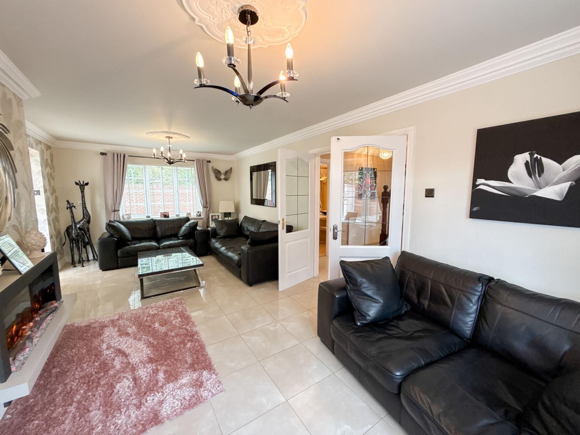 Stepping inside, the grand reception hallway immediately captures the eye with its sense of space and elegance. The layout flows seamlessly into a stunning dual-aspect lounge, complete with a bow window, a contemporary wall-mounted feature fireplace, and patio doors that lead into a delightful conservatory. From here, a further set of patio doors allows direct access to the gardens, creating the perfect space for year-round enjoyment and entertaining.