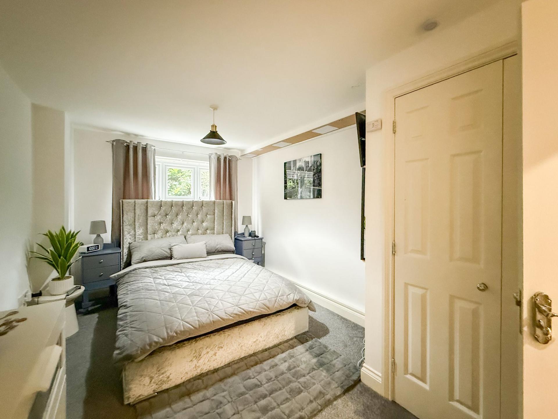 The principal bedroom is a comfortable and well-appointed double, benefiting from an en-suite shower room. The second bedroom is also a spacious double, offering flexibility as a guest room, home office, or additional living space. The accommodation is completed by a modern family bathroom, fitted with a white three-piece suite.