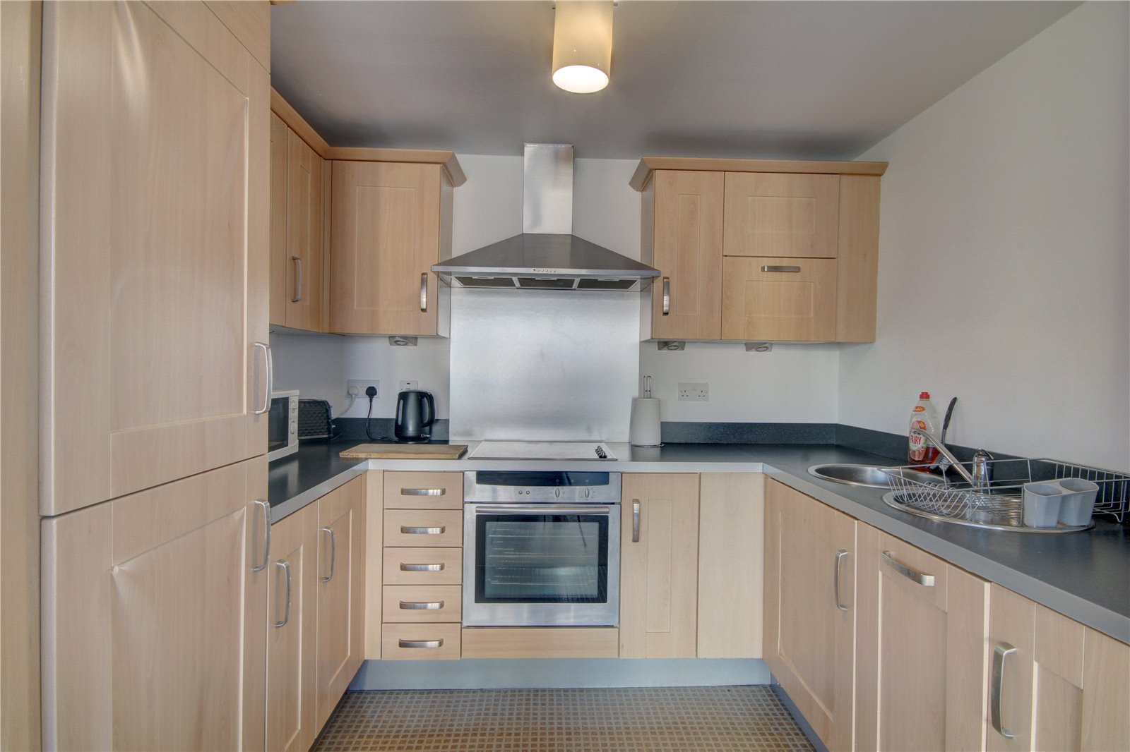 Range of wall and base units with worktop surfaces incorporating stainless steel circular sink unit with mixer tap, splashbacks, integrated electric oven and hob with stainless steel splashback and extractor, integrated fridge freezer and dishwasher.