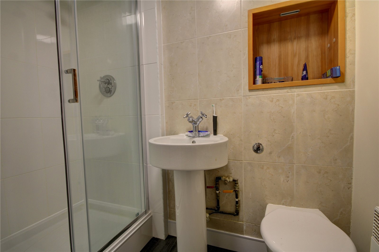 Double shower unit with glass screen, pedestal wash basin, WC, part tiled walls, extractor fan.