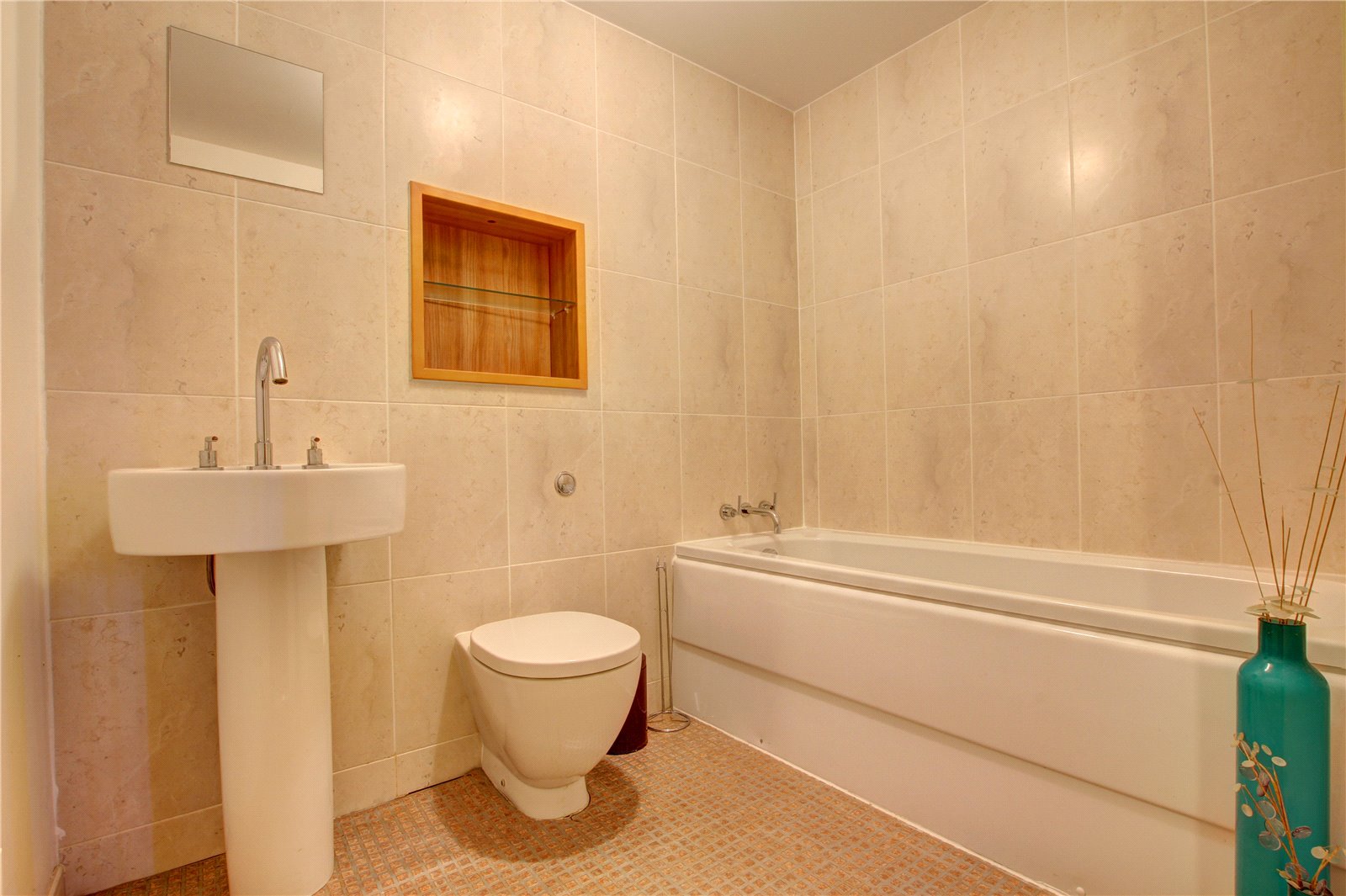 Panelled bath, WC, pedestal wash hand basin, tiled walls, extractor fan.