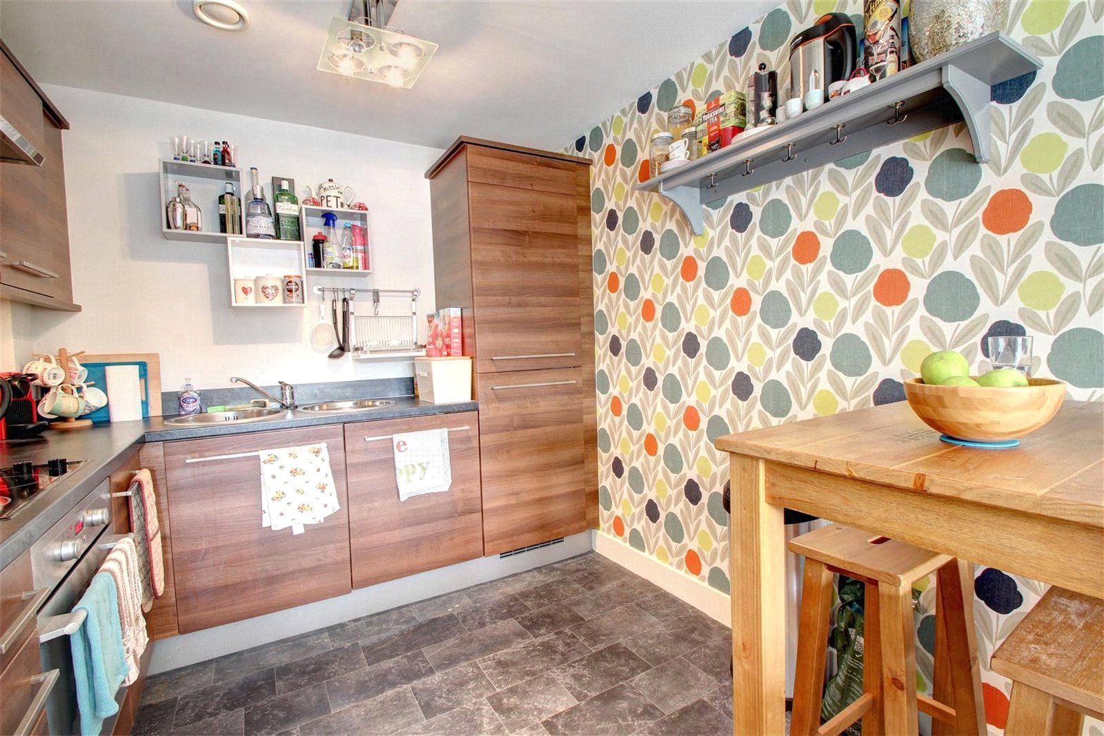 Range of wall and base units with roll edge worktop surfaces incorporating stainless steel circular sink unit with mixer tap, splashbacks, integrated electric oven and hob with stainless steel extractor above, fridge and freezer, dishwasher.