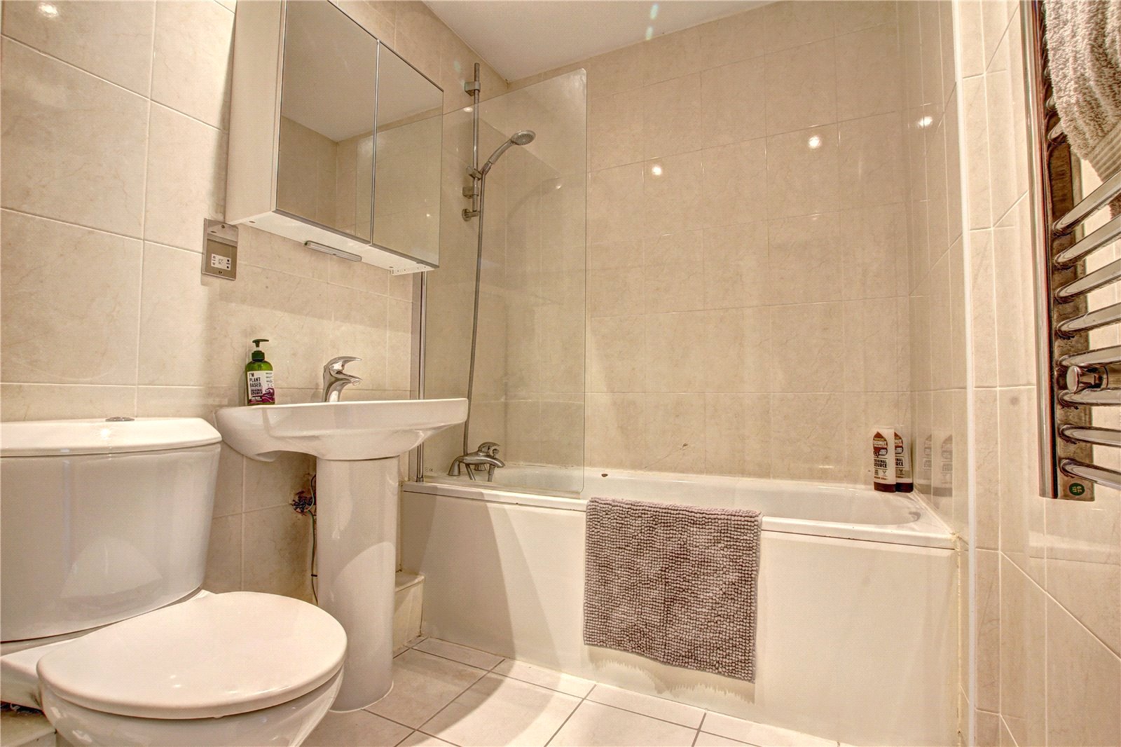 Panelled bath with shower overhead, WC, pedestal wash hand basin, tiled walls and flooring, electric shaving point, heated towel rail and extractor fan.