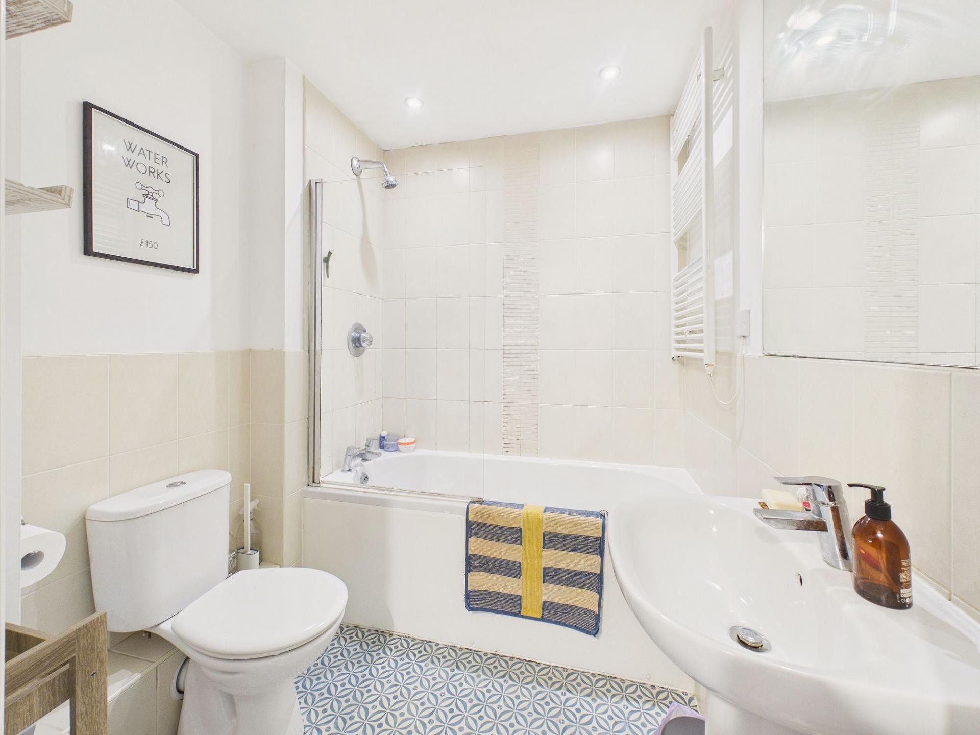 The generous double bedroom also benefits from patio doors to a Juliet-style balcony, enhancing the sense of openness and providing an attractive feature to the room. The accommodation is completed by a modern bathroom fitted with a white suite and a mains-fed shower over the bath.