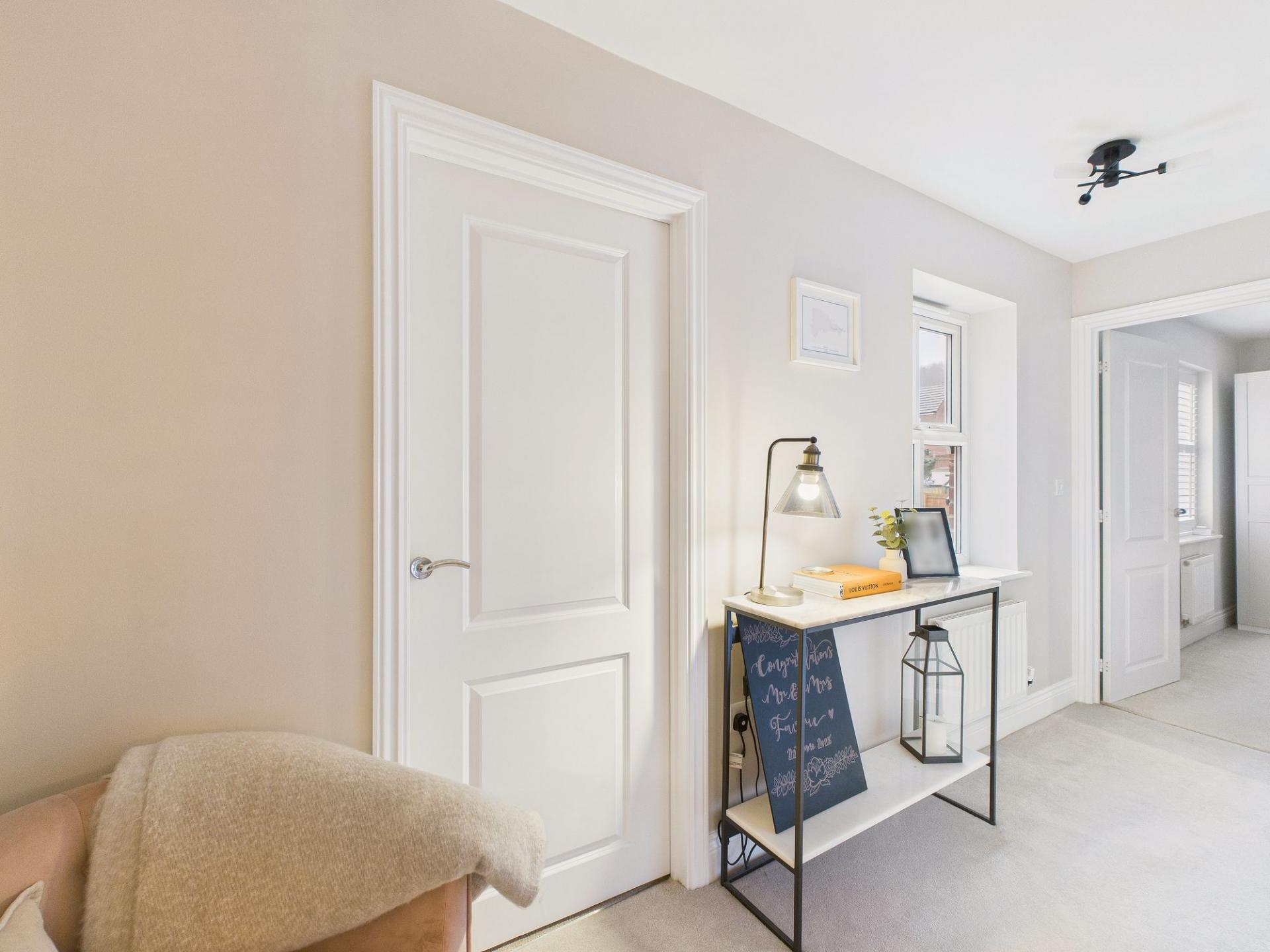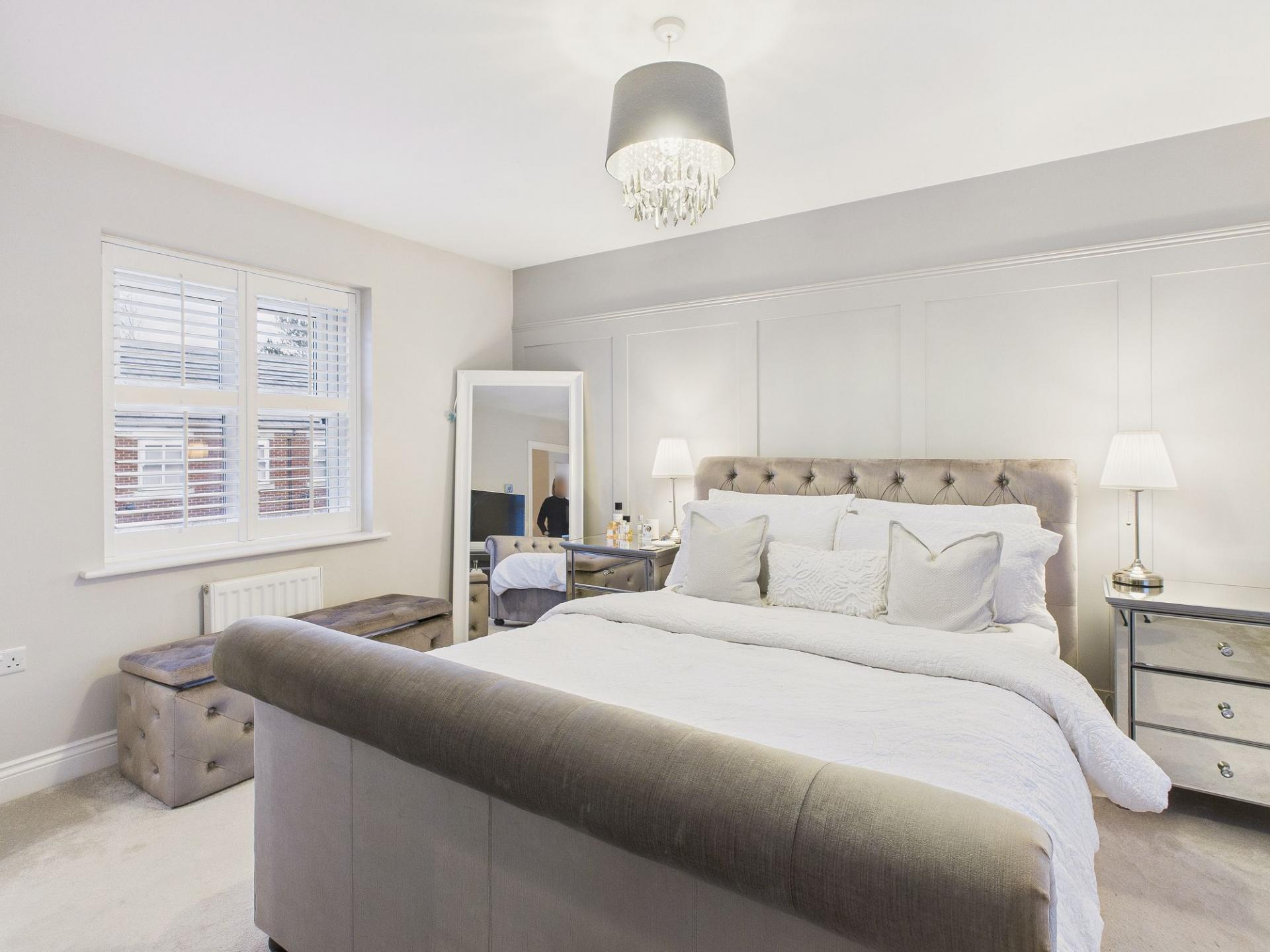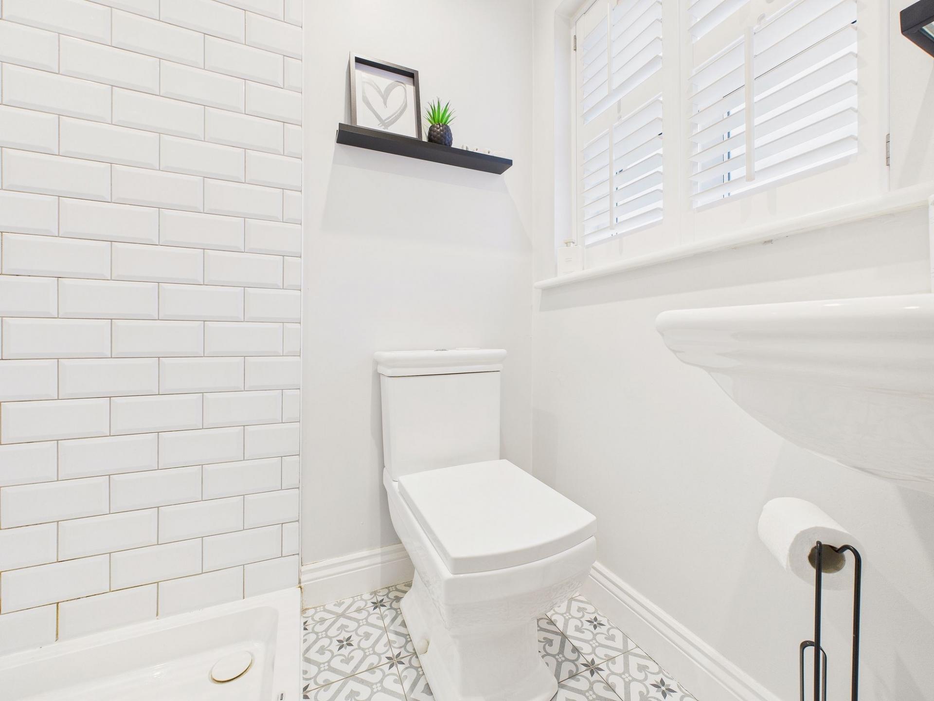 The first floor continues to impress, offering three well-proportioned and tastefully decorated bedrooms, all benefiting from plantation-style shutters. The principal bedroom enjoys the added luxury of a stylish en-suite shower room. The remaining two bedrooms are served by a stunning family bathroom, complete with a striking free-standing bath, providing a luxurious space to unwind.