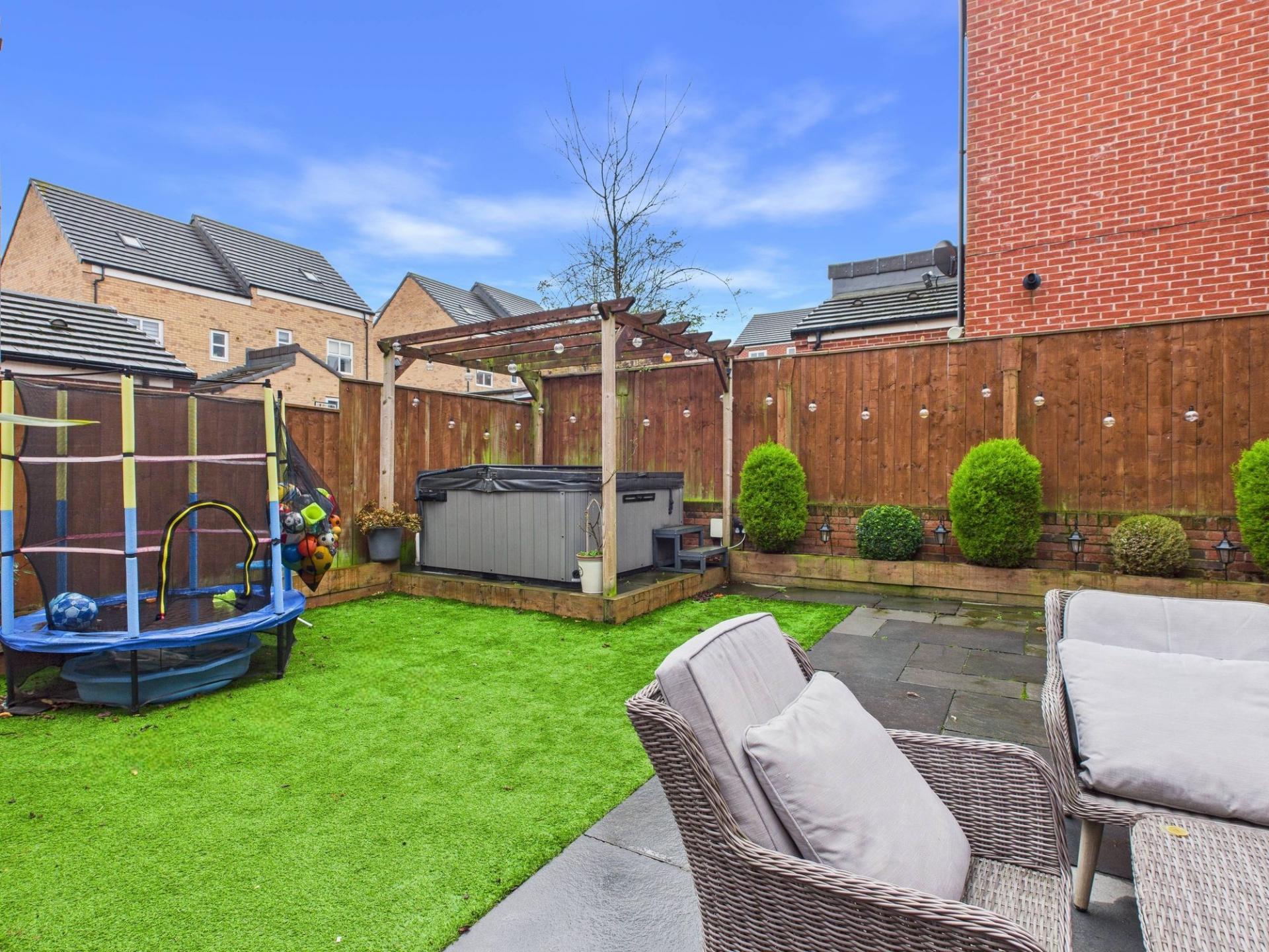 Externally, the property truly comes into its own. The enclosed rear garden has been carefully landscaped to create a superb outdoor retreat, featuring a paved patio area ideal for al fresco dining, an artificial lawn for low-maintenance enjoyment, and a pergola with space to accommodate a hot tub, perfect for entertaining or relaxing in style.