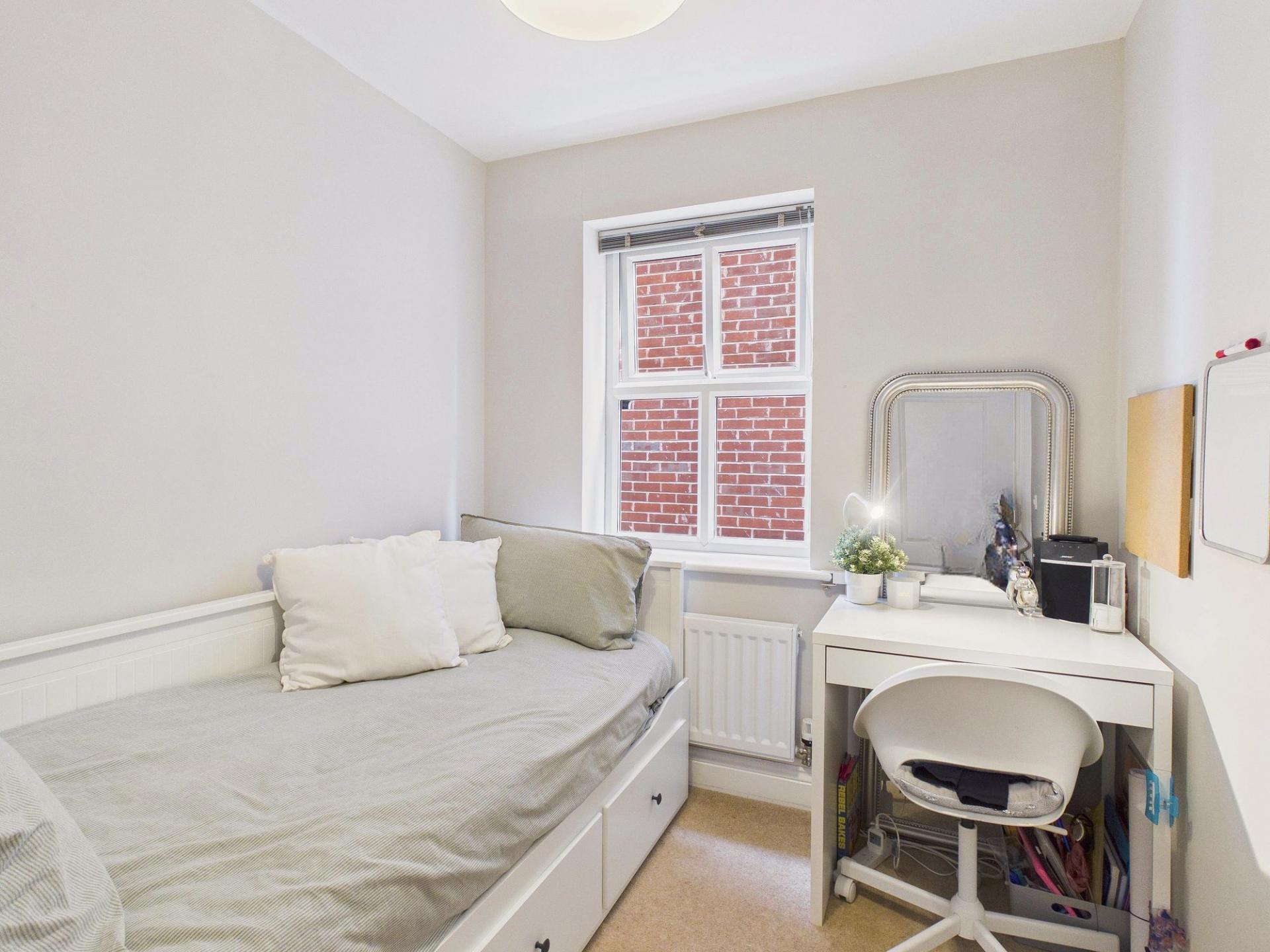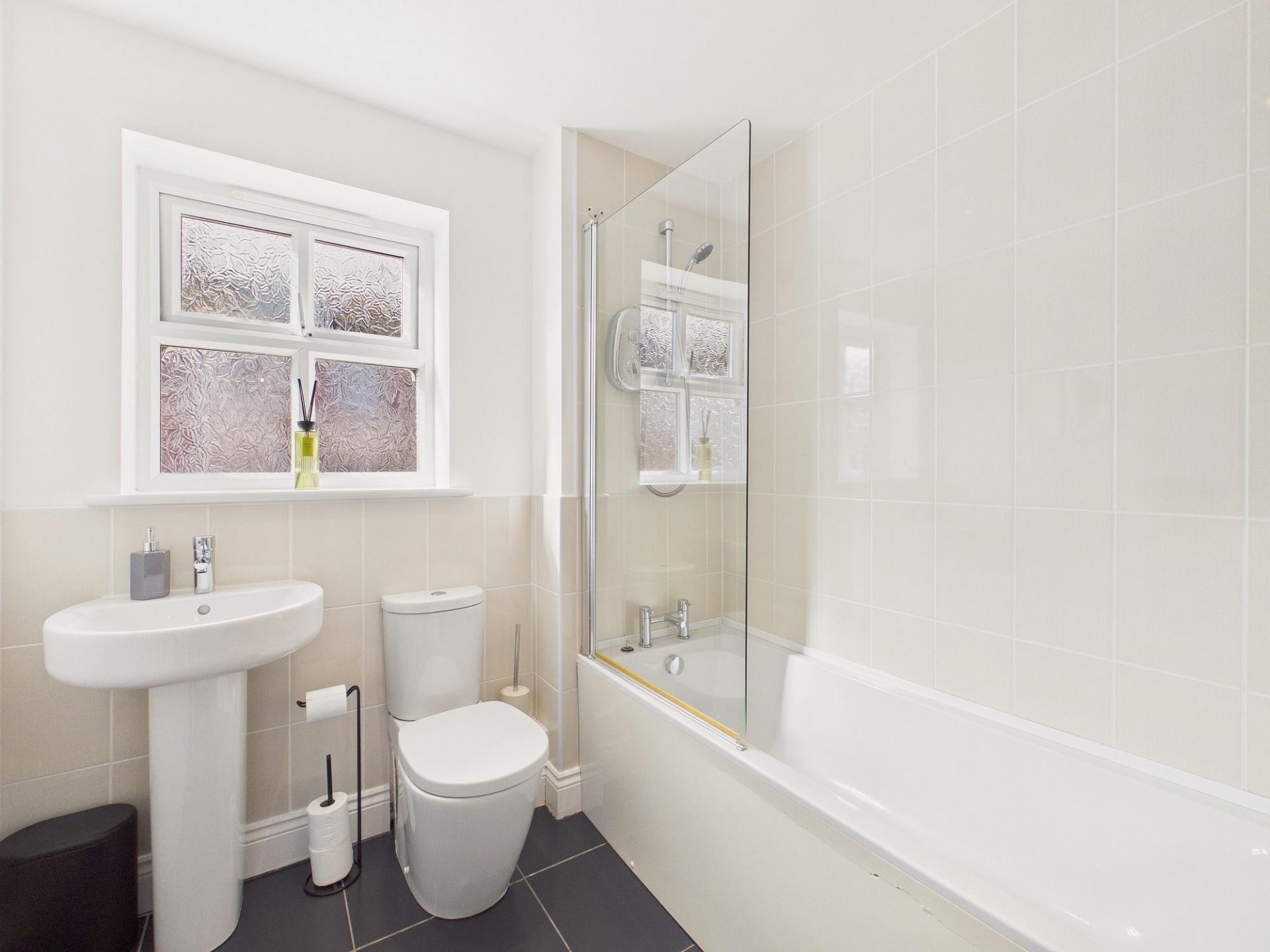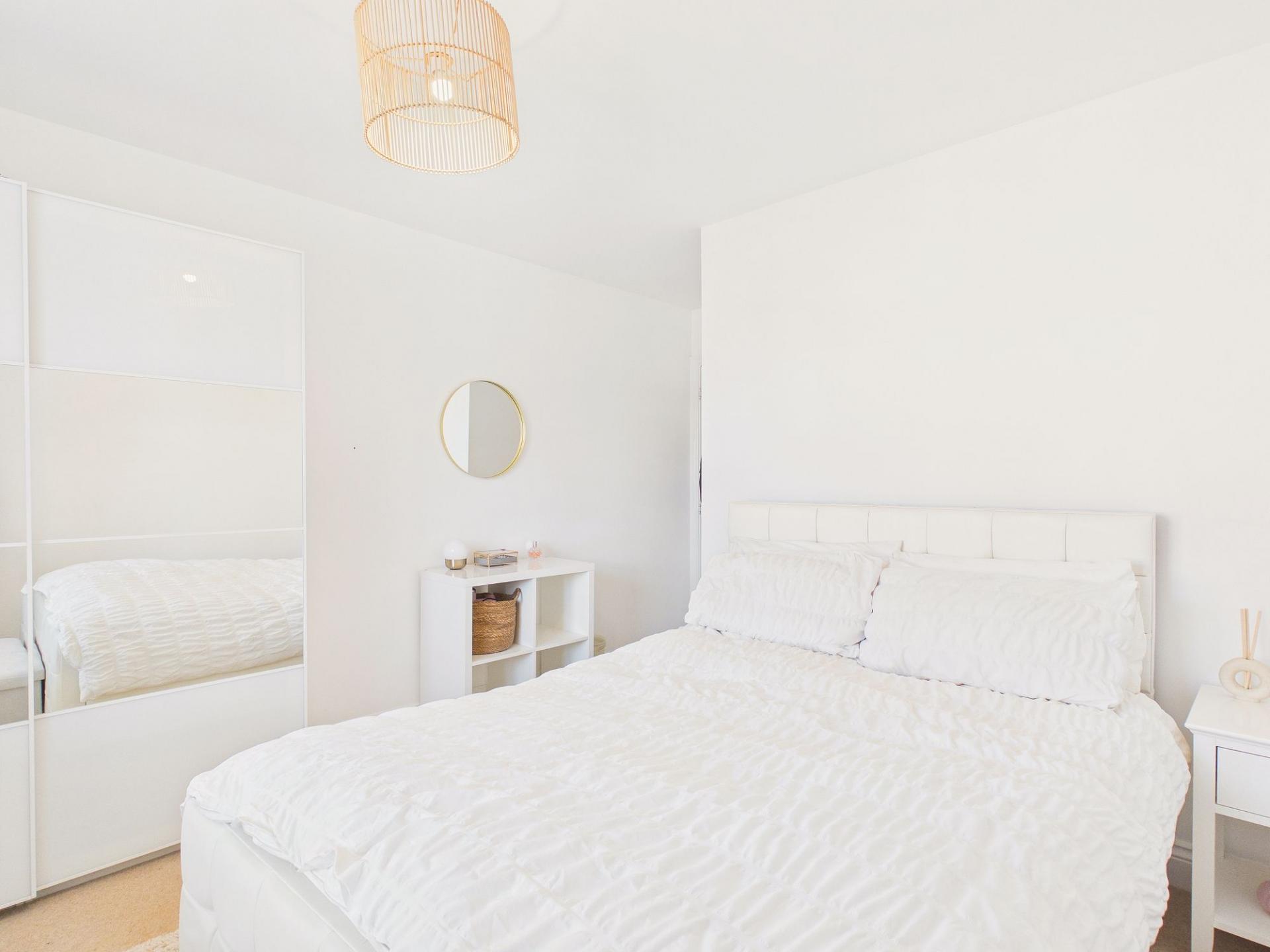 The property comprises three comfortable bedrooms, with the principal bedroom benefiting from fitted wardrobes along one wall, offering excellent storage solutions. A stylish bathroom completes the accommodation, fitted with a white suite and a convenient shower over the bath.