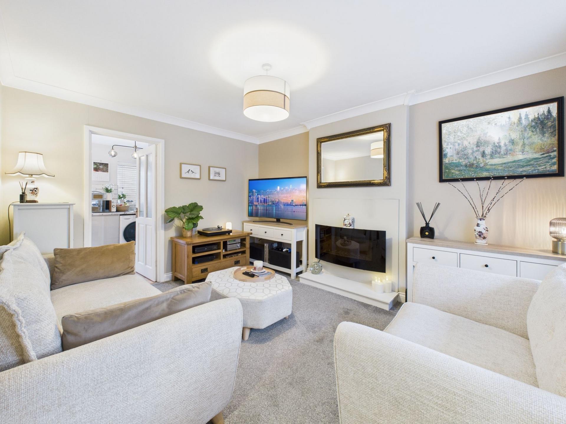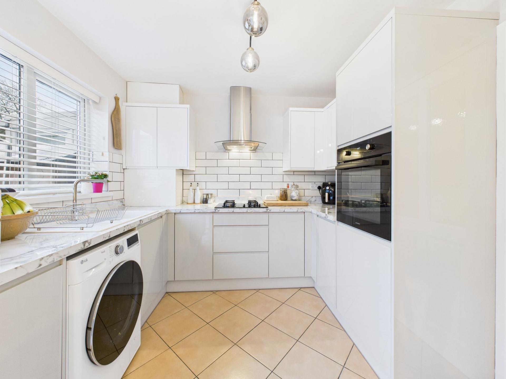 Stepping inside, the standout feature is the modern dining kitchen, fitted with contemporary units and ample space for a family dining table. Double doors open directly onto the rear garden providing a wonderful connection between indoor and outdoor spaces—perfect for children playing or for hosting guests.