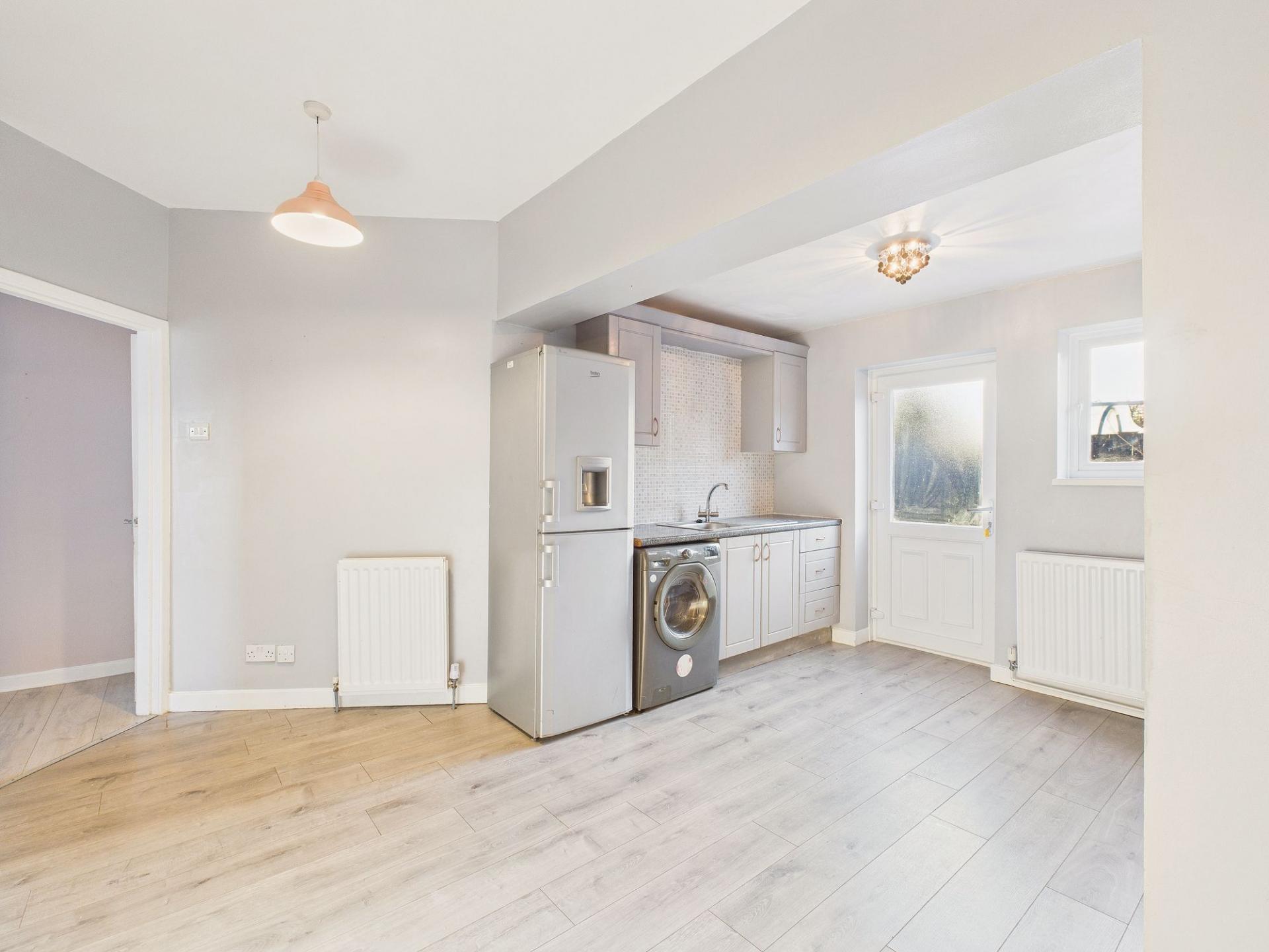Upon entering the home, you are welcomed by an inviting entrance hallway which leads through to a spacious front-facing lounge. This bright and welcoming room features a modern fireplace set neatly into the chimney breast, creating an attractive focal point and a cosy atmosphere for relaxing or entertaining. To the rear of the property lies an open-plan fitted kitchen with ample space for dining. The kitchen is equipped with a range of modern units, built-in cooking appliances, and enjoys direct access to the rear garden via a door, making it ideal for everyday living and social gatherings. A downstairs bathroom fitted with a modern white suite completes the ground floor accommodation.