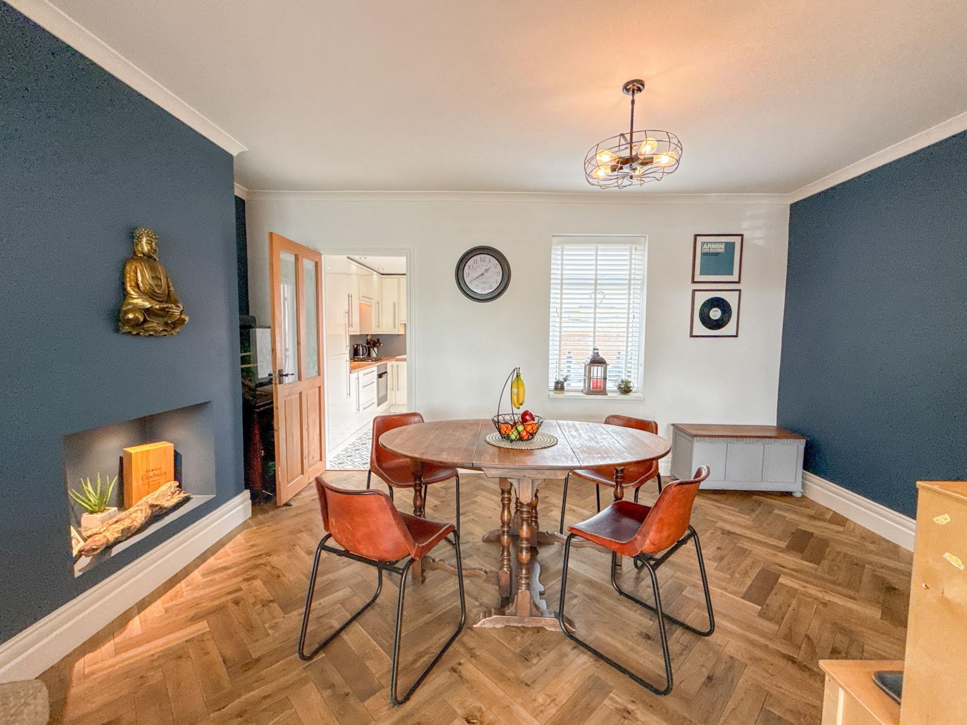 Flowing seamlessly from the lounge, the open-plan dining area provides an ideal setting for both everyday family meals and more formal entertaining. Positioned to the rear of the property, it includes a charming recess within the chimney breast, perfect for decorative touches, adding to the room’s versatility and style.