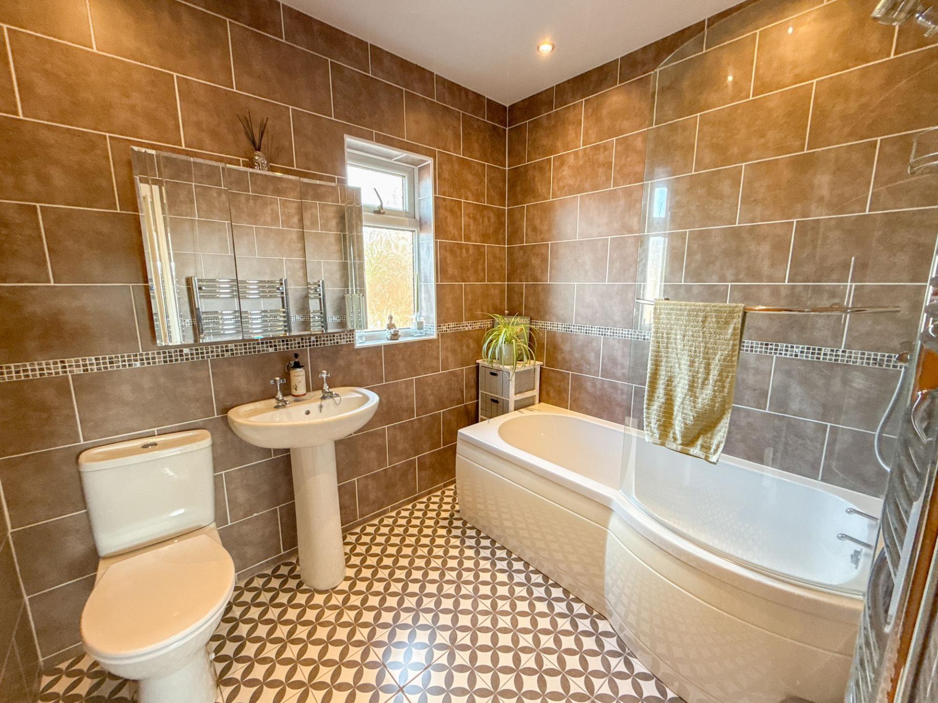 Upstairs, the property continues to impress with three generously proportioned bedrooms, all offering a comfortable and inviting atmosphere. The main bedroom benefits from fitted wardrobes, providing excellent storage while maintaining an uncluttered appearance. The modern family bathroom includes a WC, hand wash basin, and a panelled bath with shower over and glass screen — perfect for both quick morning routines and relaxing evening soaks.
